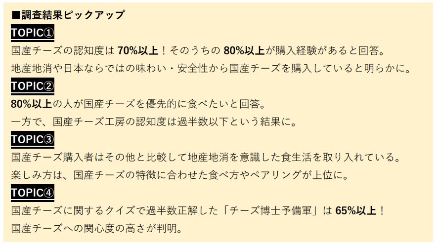 <国産チーズ全国調査>国産ナチュラルチーズがグルメ感度の高い層で人気 認知度・購入経験ともに70%以上と驚きの結果に!価格のハードルを乗り越える国産ナチュラルチーズの魅力とは