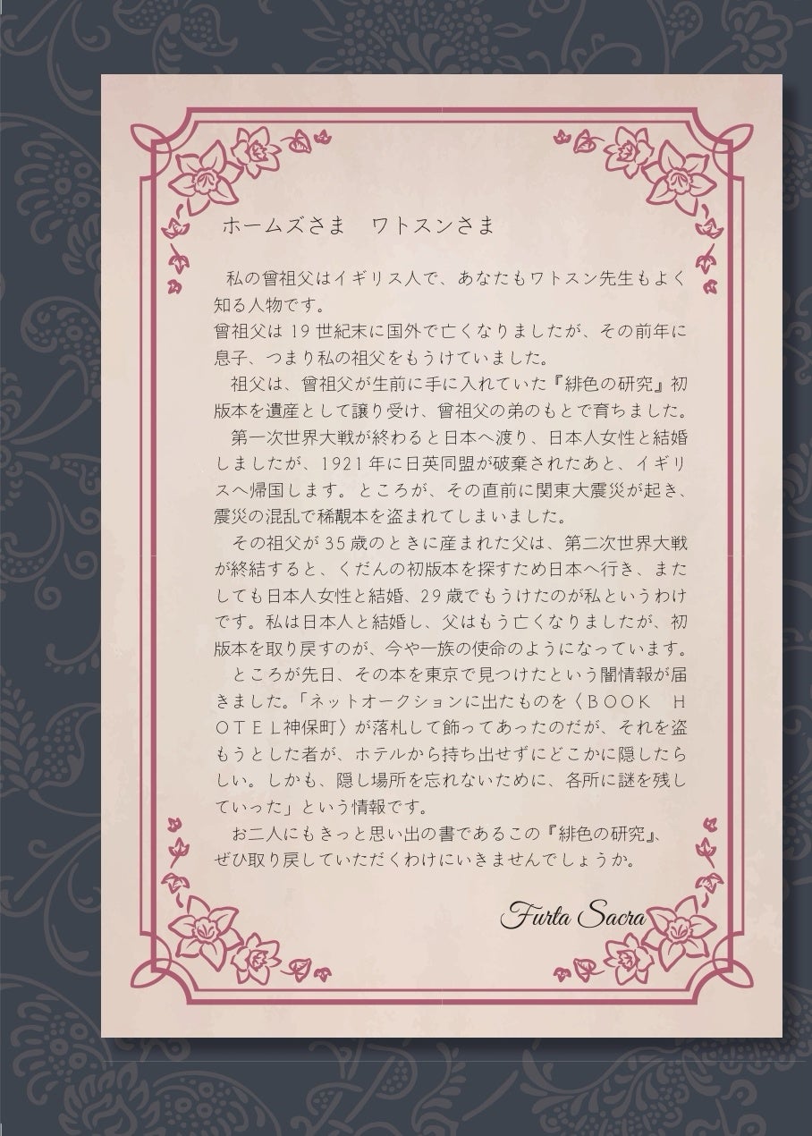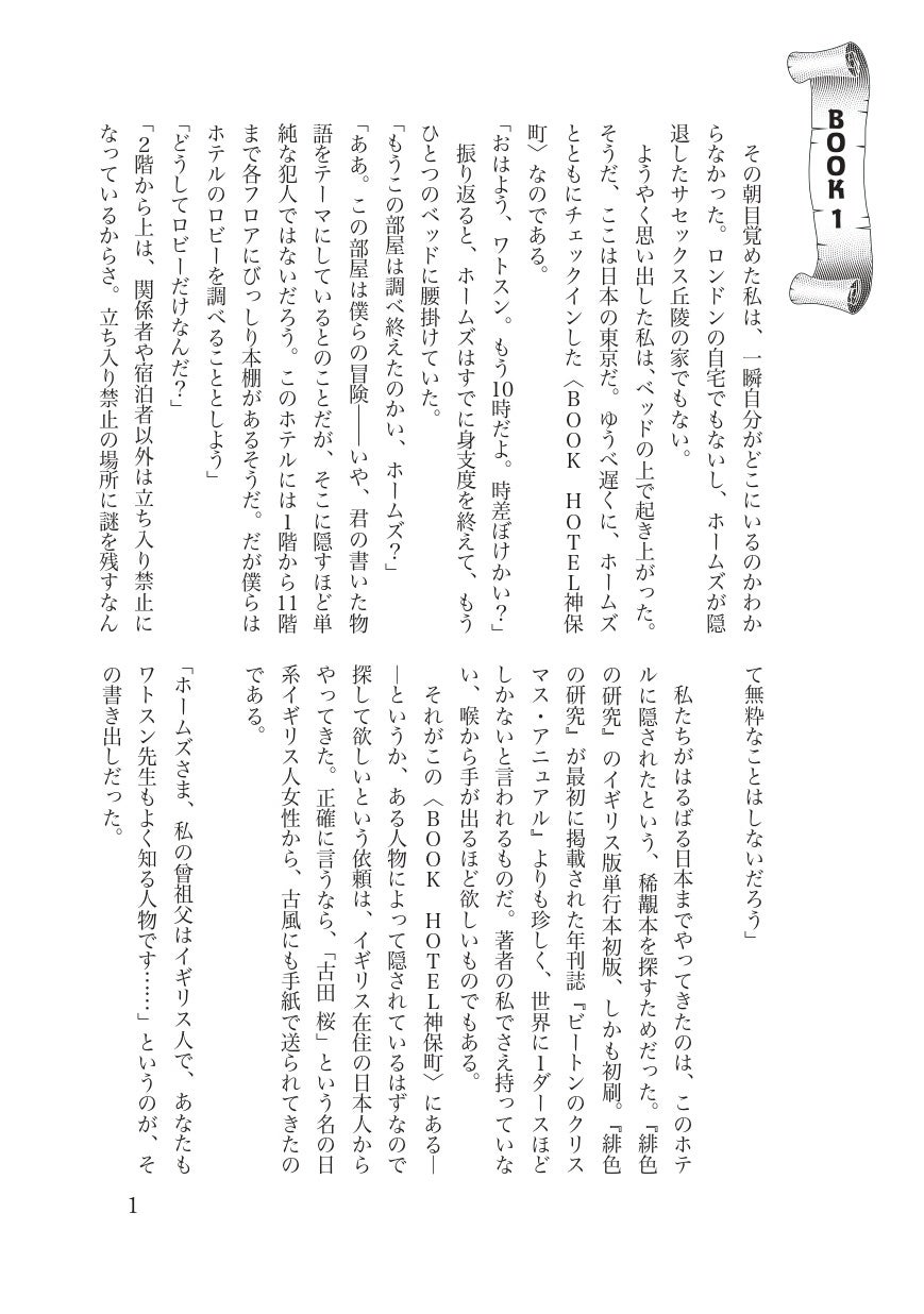 とある女性「古田桜」から、稀少本『緋色の研究』の初版本を探す依頼を受けたホームズとワトソン。 調査のためにBOOK HOTEL 神保町に宿泊し、神保町の書店を巡ることに。 しかし、見つかるのはレプリカばかり。 なぜ本物が出てこないのか? 稀少本に隠された秘密とは? そして依頼主「古田桜」の正体とは……?