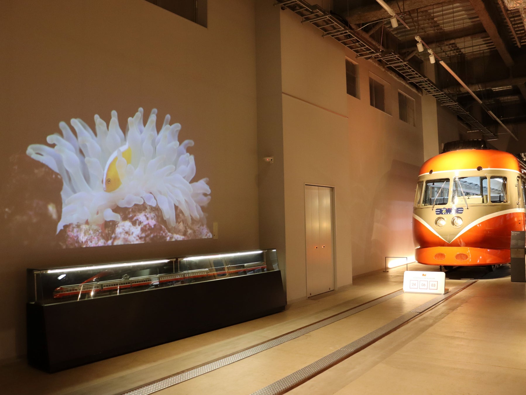 歴代ロマンスカーを展示しているロマンスカーミュージアム内1階「ロマンスカーギャラリー」にて、当館の「恋愛運ゾーン」で暮らしている開運魚たちの映像を放映し、展示車両と魚たちが作り出す、ロマンス溢れる空間を演出します。