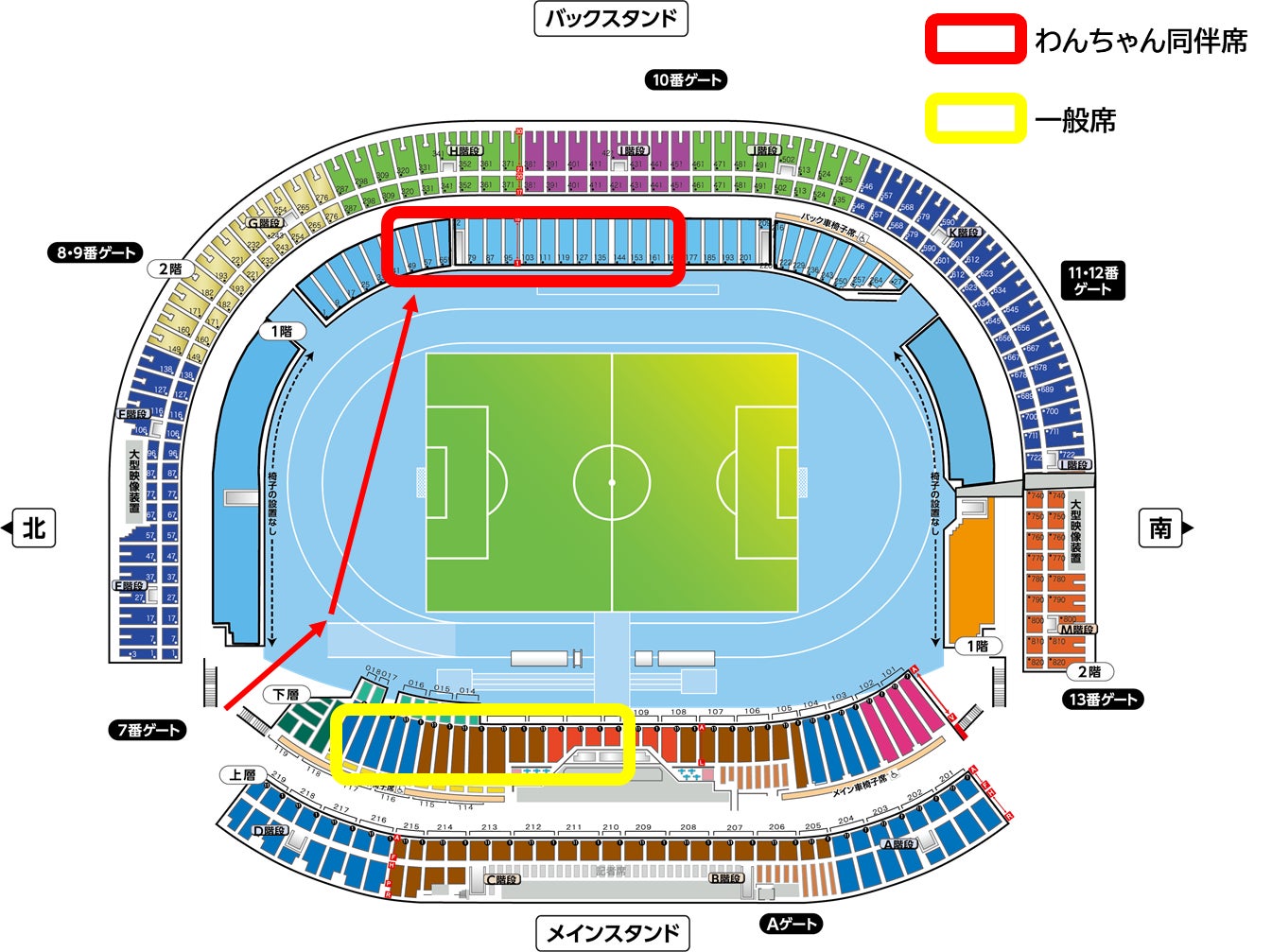 ・「ワンちゃん同伴専用エリア」以外のスタジアムエリアには、ペットを連れての立ち入りはできません。ワンちゃん同伴のお客様は、バギーでも入場ができる7番ゲート下からご入場いただきます。