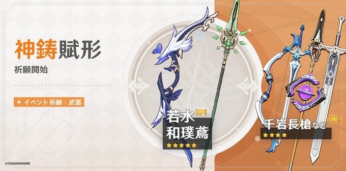 期間中、新★5武器「弓・若水」、★5武器「長柄武器・和璞鳶」などの出現率が大幅にUPします。