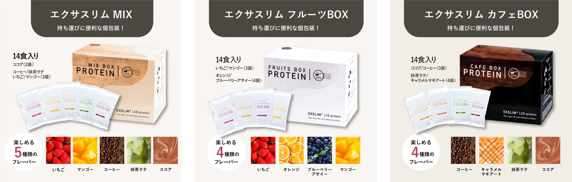 ・エクサスリム LCD プロテイン(ミックス/フルーツBOX/カフェBOX) 各5,980円(税込)送料無料