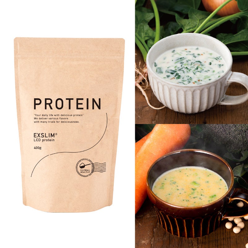 ・エクサスリム LCD プロテイン(ほうれん草と香ばし玉葱のクリームスープ/人参とブロッコリーのカレー風味シチュー)各2,980円(税込)送料無料 ※2個以上のお買い上げでオリジナル専用トートバッグプレゼント!