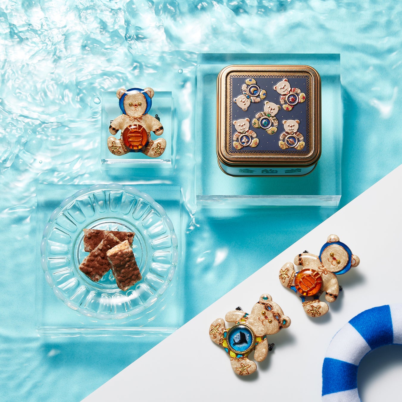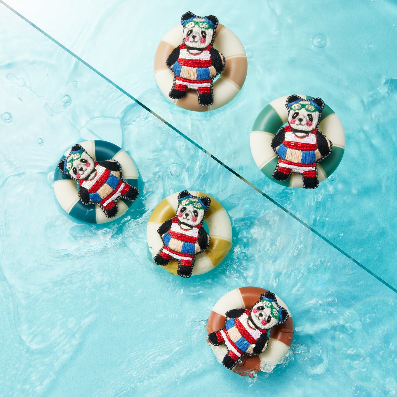 ヘルシースイーツ・青山デカーボからお菓子缶「刺繍バッグ缶」や「ミニくま缶」に描かれたパンダやくまが水着を着た「水泳パンダブローチ」「水球くまブローチ」「水泳くまブローチ」を2023年7月5日(水)から7月11日(火)まで大丸福岡天神店の期間限定ショップにて数量限定発売する。