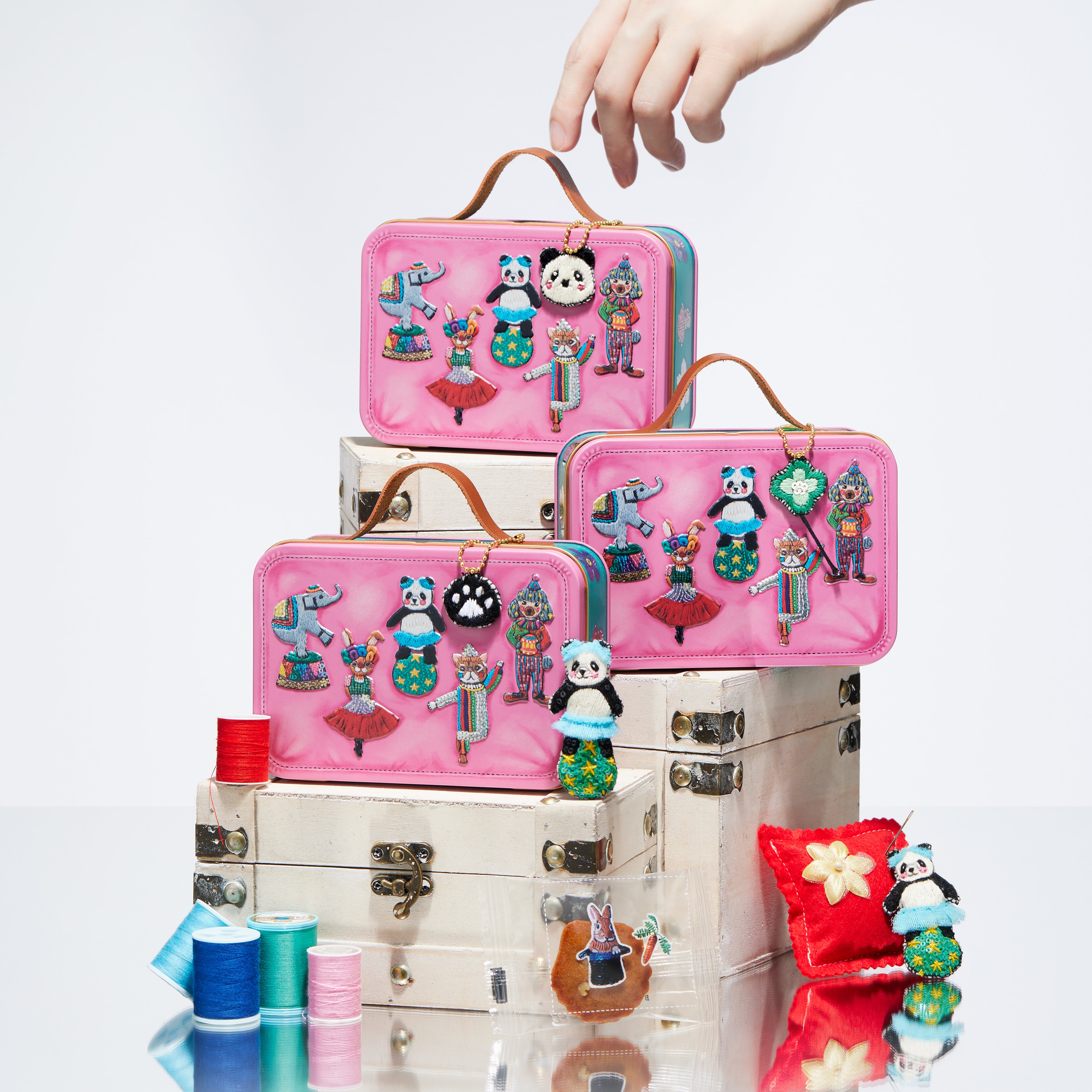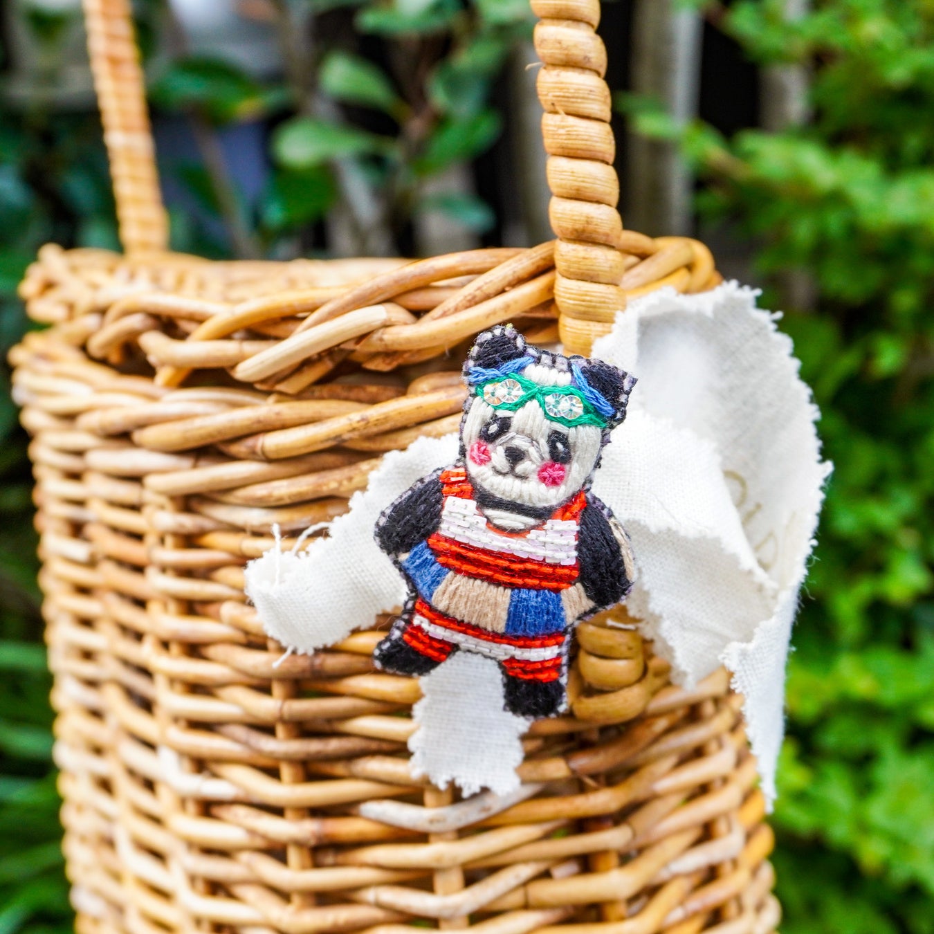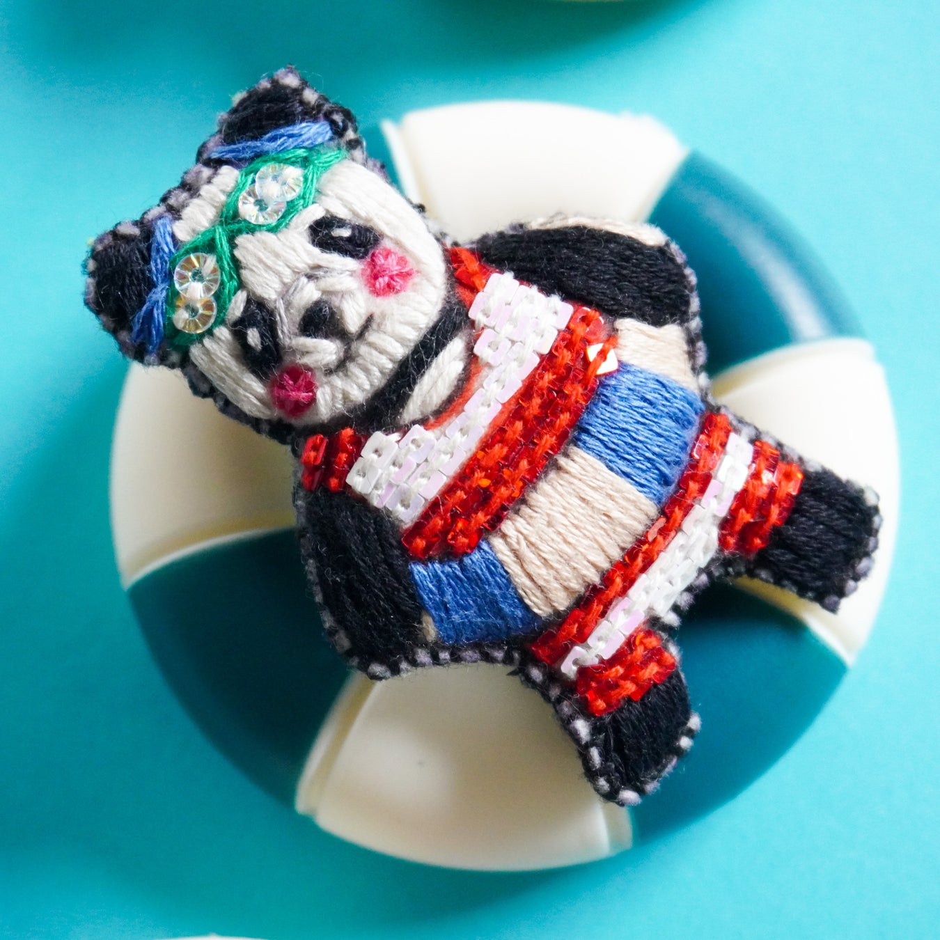 一つ一つ手刺繍で作った水泳パンダの刺繍ブローチ、