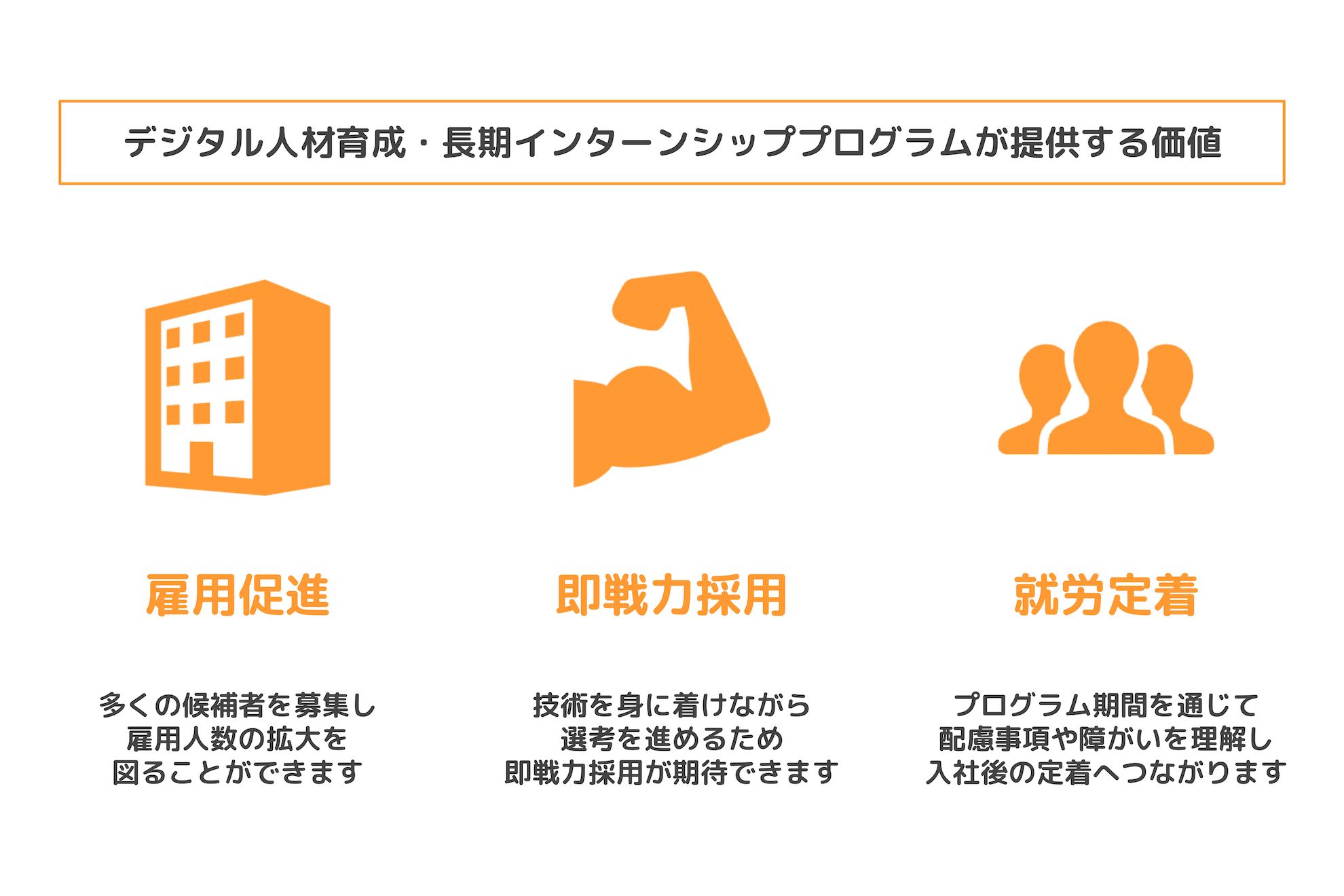 実施企業は、即戦力人材を育成しながら、障がい者雇用促進を図ることが可能です。また、本プログラムの実施期間を通じて、参加者の配慮事項把握や、それに応じた受入部門側での障がい理解・受入体制の構築を進めることができるため、長期継続できる障がい者雇用の体制作りを行うことができます。
