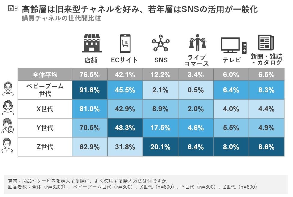 SNSの活用については、購買チャネルでも世代間の差がある(図9)。SNSを最も活用しているのはZ世代で、ソーシャルコマースはECと同レベルの重要チャネルになっており、ライブコマースの利用率も他世代より高い。それに続くのがY世代で、X世代とベビーブーム世代は大きな後れを取っている。