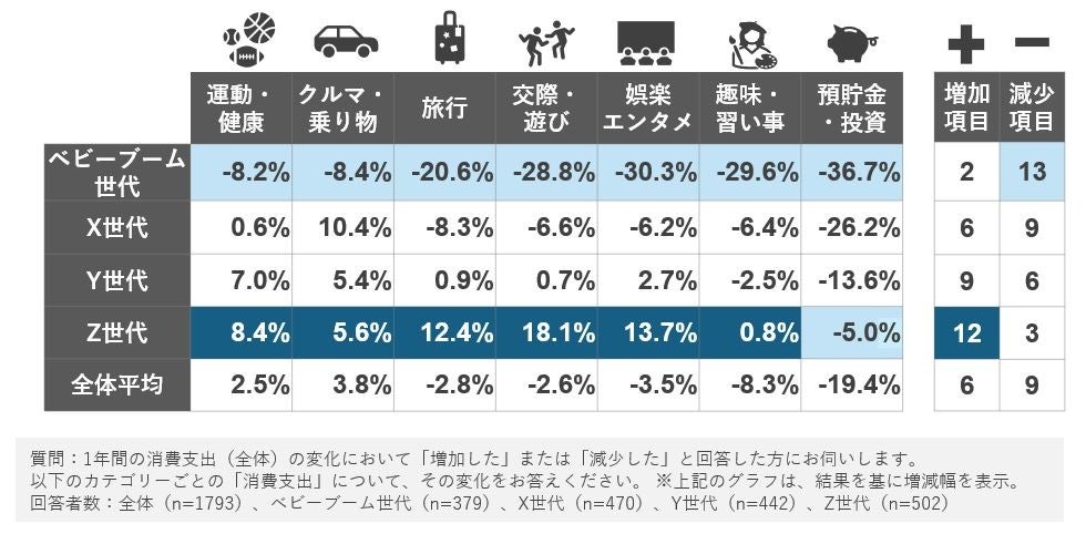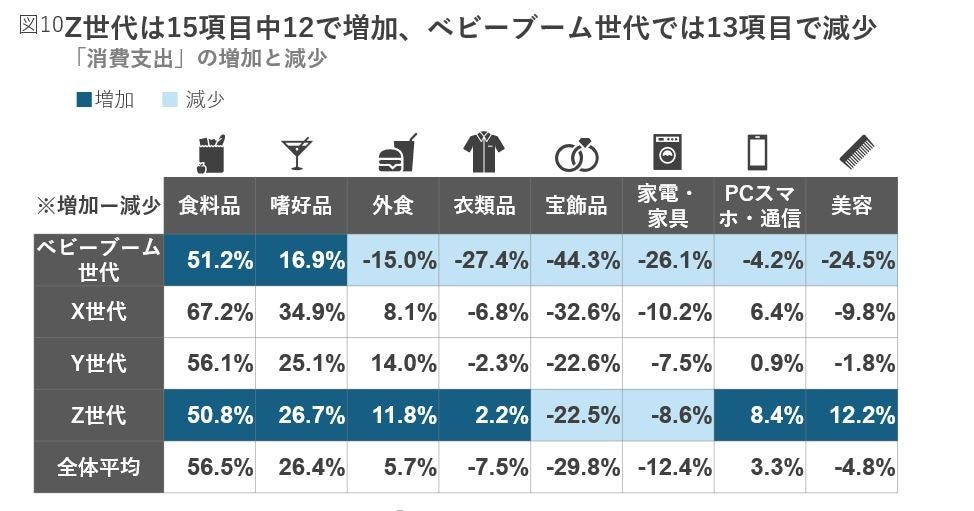 世代ごとの消費支出の特徴としては、ベビーブーム世代とX世代は、食関連の消費が増加したことで、それ以外のカテゴリーでの支出を減少させているが、Y世代とZ世代は、ある程度全てのカテゴリーで消費が増加している。当社の調査では、15のカテゴリーで消費の増加指数を見ているが、ベビーブーム世代では15のうち13項目で減少、他方、Z世代は、15のうち12項目で増加しており、消費に対するアプローチが異なっている(図10) 。