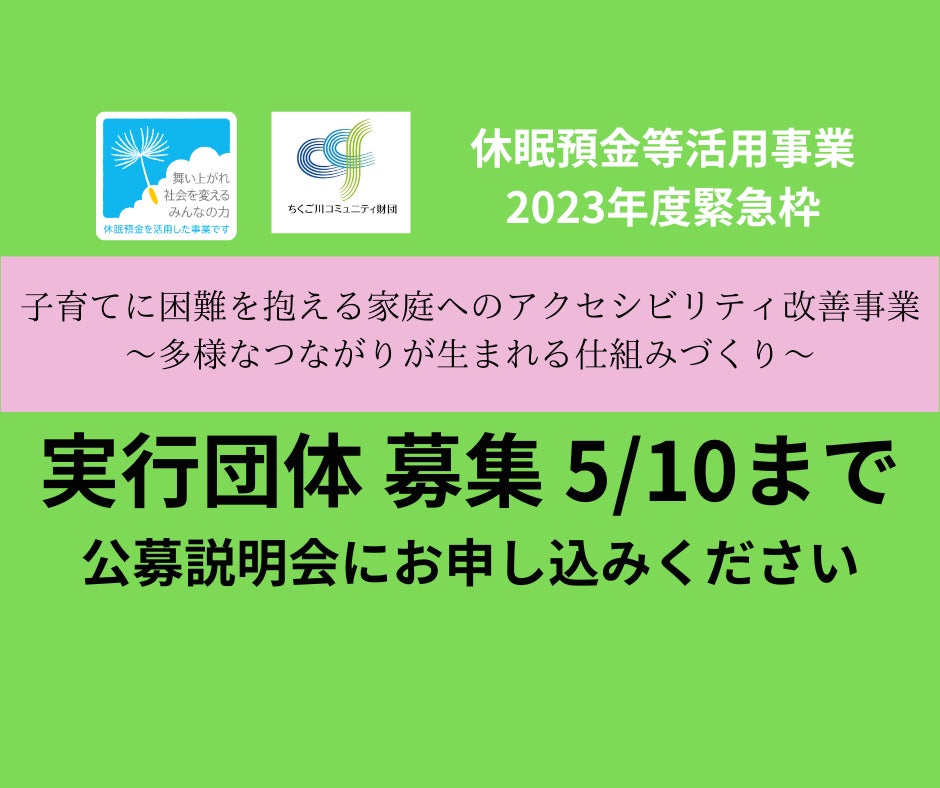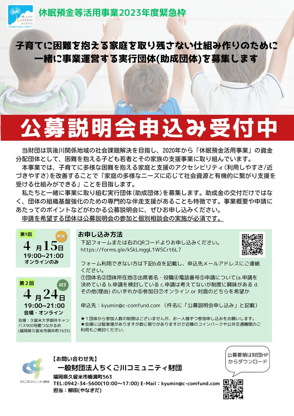 一般財団法人ちくご川コミュニティ財団(福岡県久留米市)は、2023年度緊急枠(第4次)の休眠預金等活用法に基づく資金分配団体に採択されました。私たちと一緒に事業に取り組む実行団体(助成先)を5月10日まで募集します。