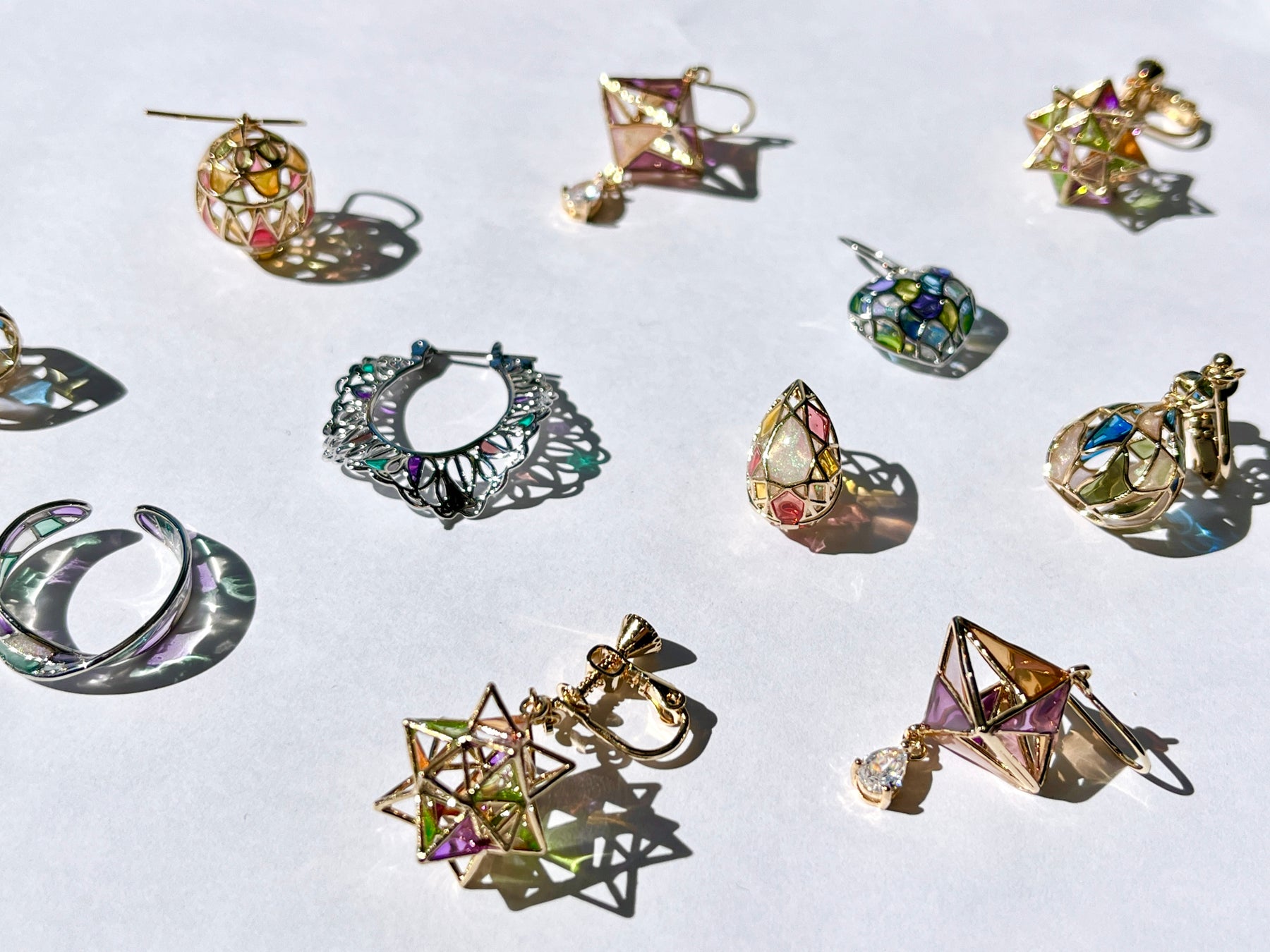 モロッコタイルとステンドグラスの彩りを閉じ込めた、唯一無二のアクセサリー。光を受ける度に表情を変える、美しいデザインをお楽しみください。