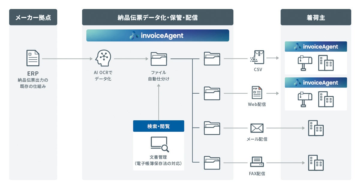 ウイングアークは、これまでも行政や荷主事業者等と連携して伝票の電子化を実現する取り組み(※1)を推進してきました。同社が提供する電子帳票プラットフォーム「invoiceAgent」を活用することで、既存の紙伝票を出力する仕組みを、基幹システムを変更することなく、伝票発行をデジタル化できます。これにより、取引先である着荷主に対し、納品伝票情報をPDFおよびデジタルデータとして事前に提供することが可能になります。