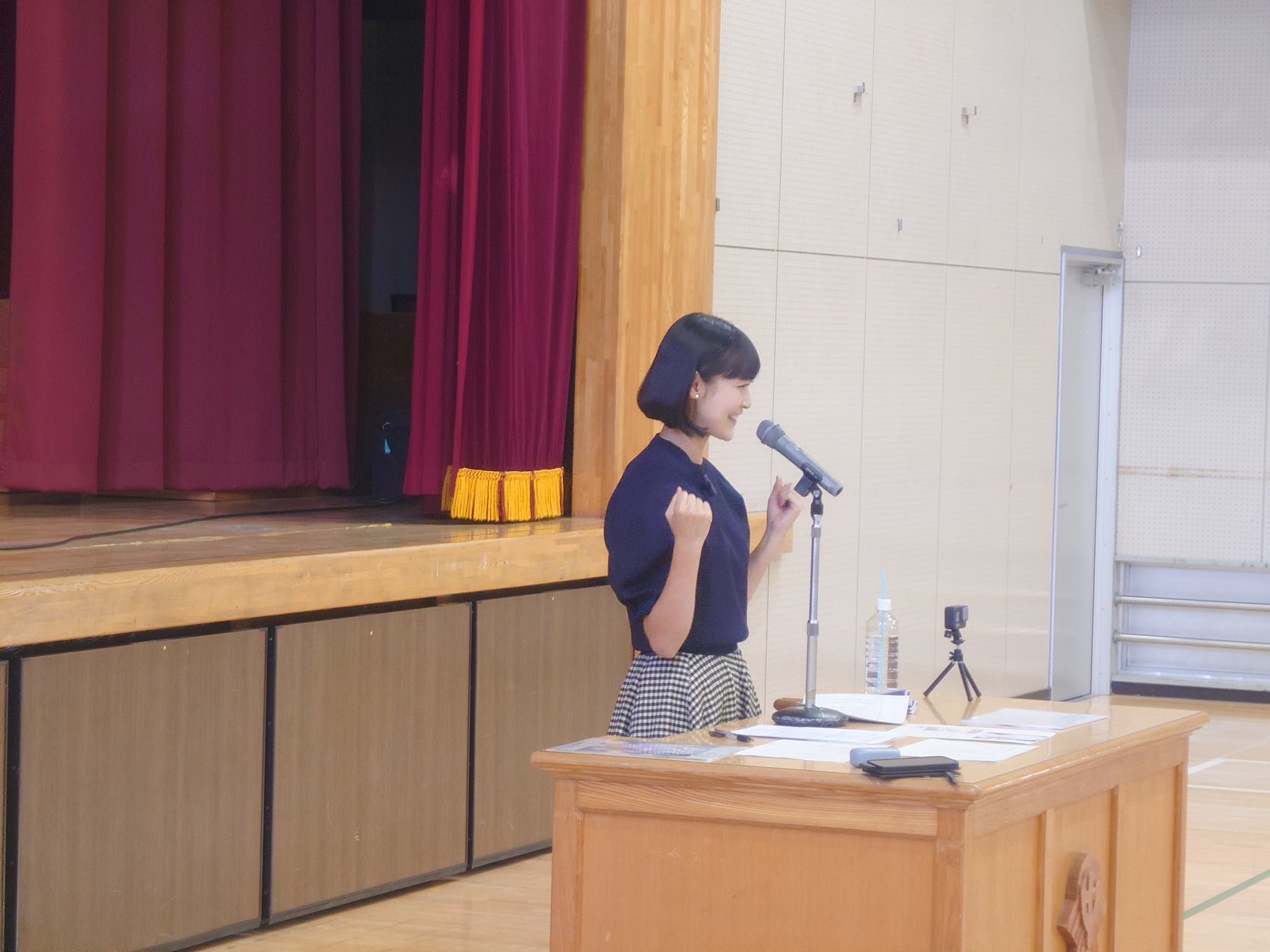 声優から生徒へのメッセージ。学校からのリクエストである「読書・本を読むことの大切さ」をテーマに「本を手に取ってわくわくすること、想像することを体験してほしい」との話に子どもたちにも大変共感していました。