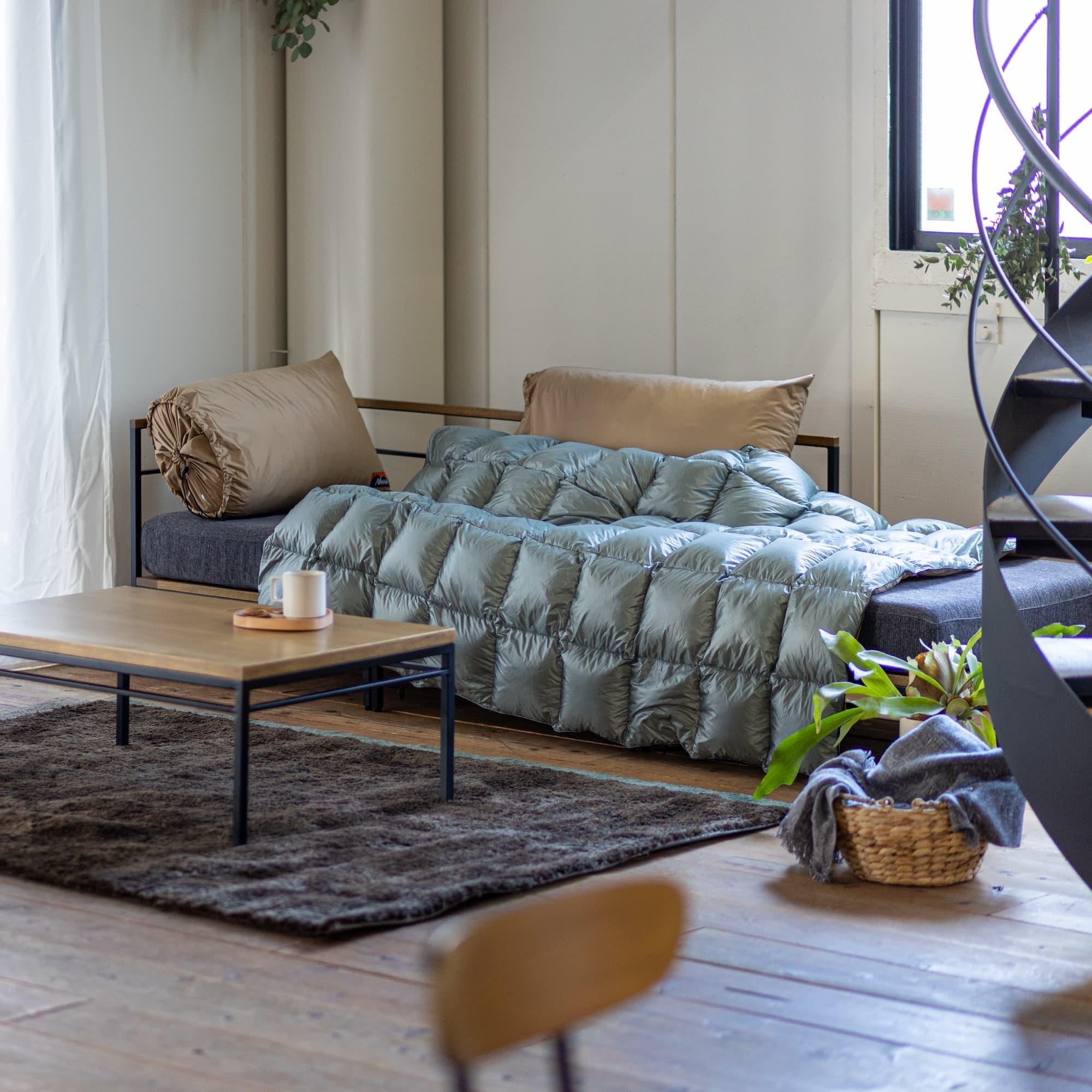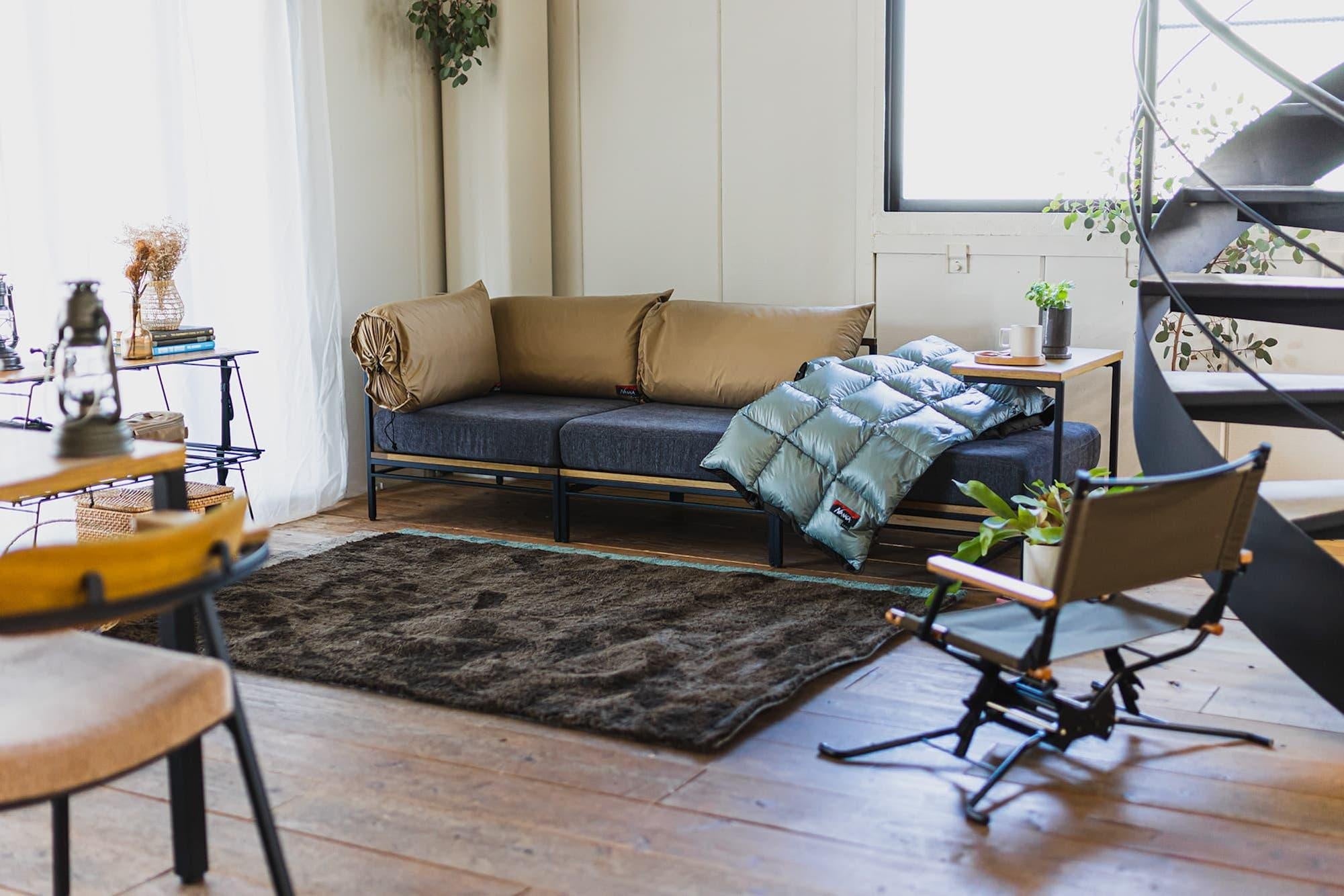 背もたれのクッションカバーをシェラフをイメージしたNANGA製のスタックサック型にし、家の中にもアウトドアのテイストを取り入れ、生活がより楽しく感じるアイテムをという思いで企画しています。