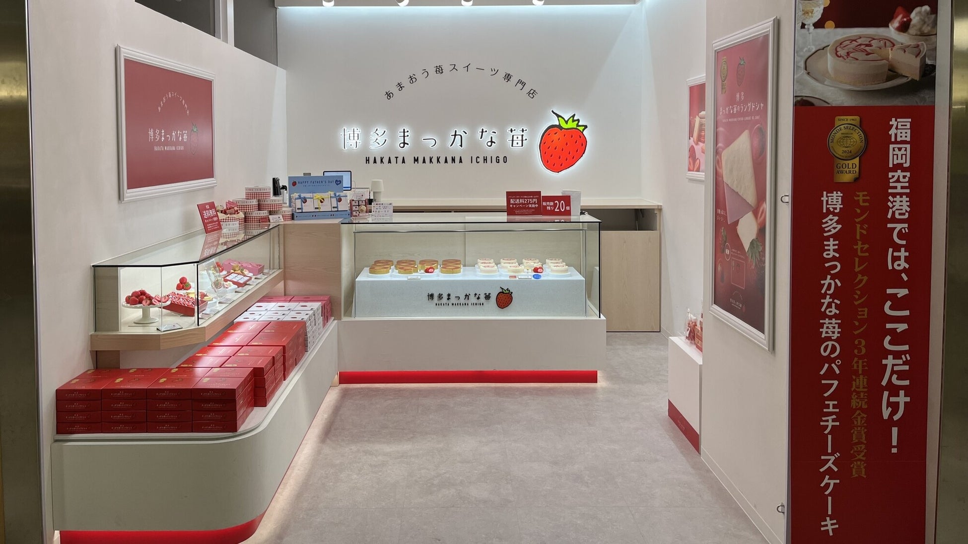 2014年に博多のお土産として誕⽣した「博多まっかな苺のラングドシャ」から始まった、まっかな苺マークが目印のあまおう苺スイーツ専門店です。