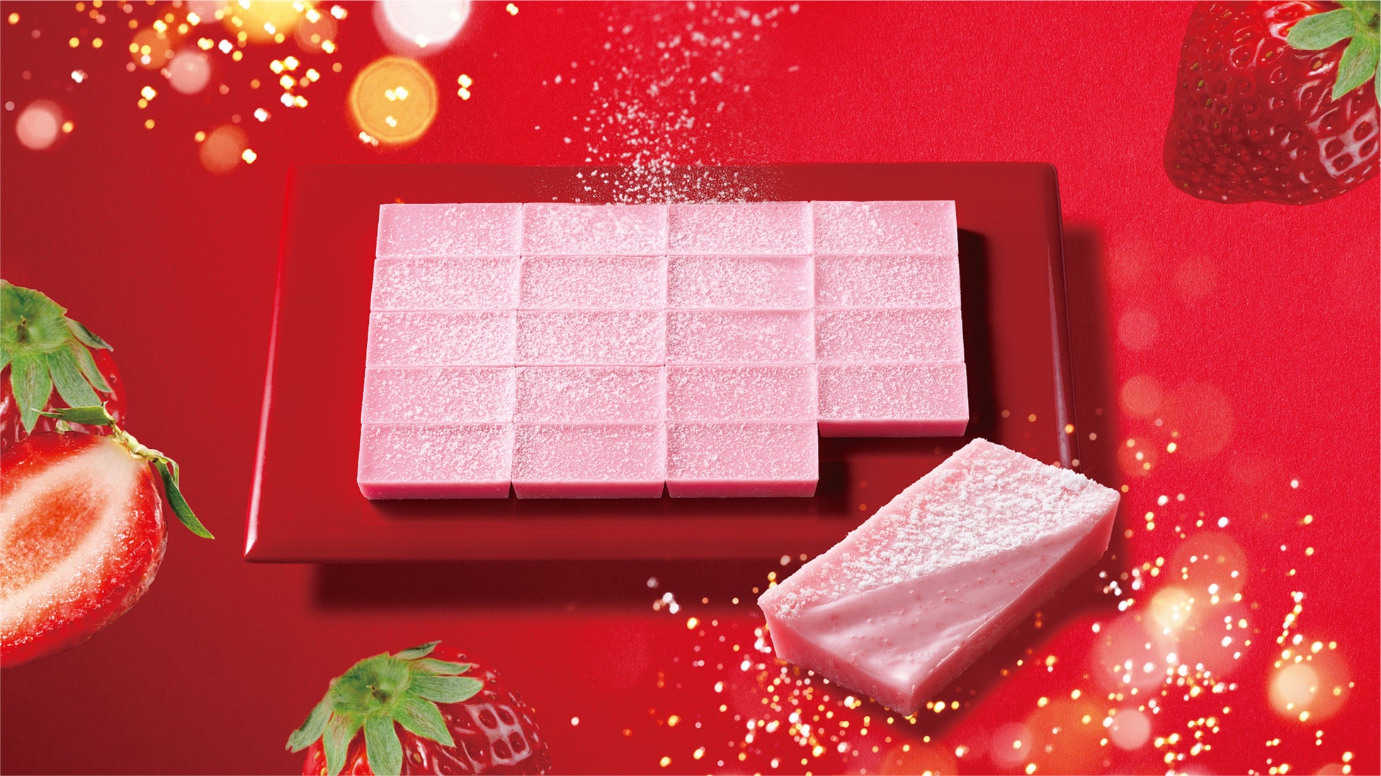 まるで雪化粧のような粉糖を纏った、みずみずしい果実感あふれる、甘酸っぱいあまおう苺チョコレートです。