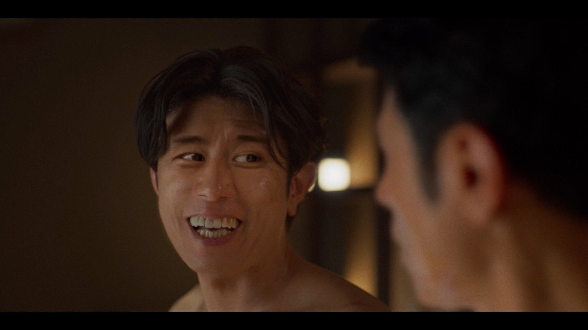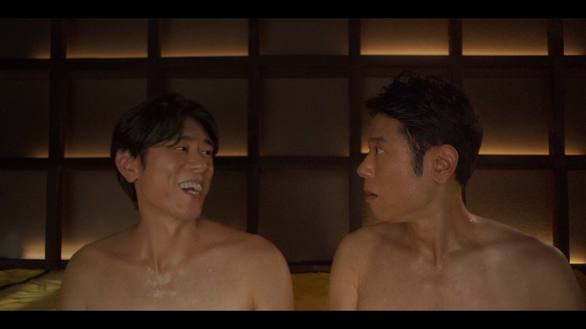 露天風呂に浸かる原田さんと中村さん。「いい歳のとり方をしたいですね」という中村さんの発言に、原田さんは「いい歳ね…」と何か考える表情で呟き、空を眺めます。その後、原田さんがサウナ室に入ると突如、AI技術により再現された“20代の原田さん”が登場します。驚く原田さんそっちのけで「お笑いで世界、変えられた?」と若き原田さんから無邪気な質問が投げかけられます。咄嗟に「あの時は若かったから」と口にするものの、がむしゃらに前に進んでいた当時の自分がフラッシュバック。続けて「小学校の作文のタイトル、覚えている?今を大切に。だよ」と伝え、昔の自分はこつぜんと姿を消してしまいます。若き頃の熱い気持ちが年齢と共に薄れてしまっていたことに気づかされた原田さん。髪を洗いながら「今を大切に…なんだよ」と中村さんに、そして自分に言い聞かせるように一言。現在53歳の原田さんが20年前の自分に背中を押される様子が描かれています。