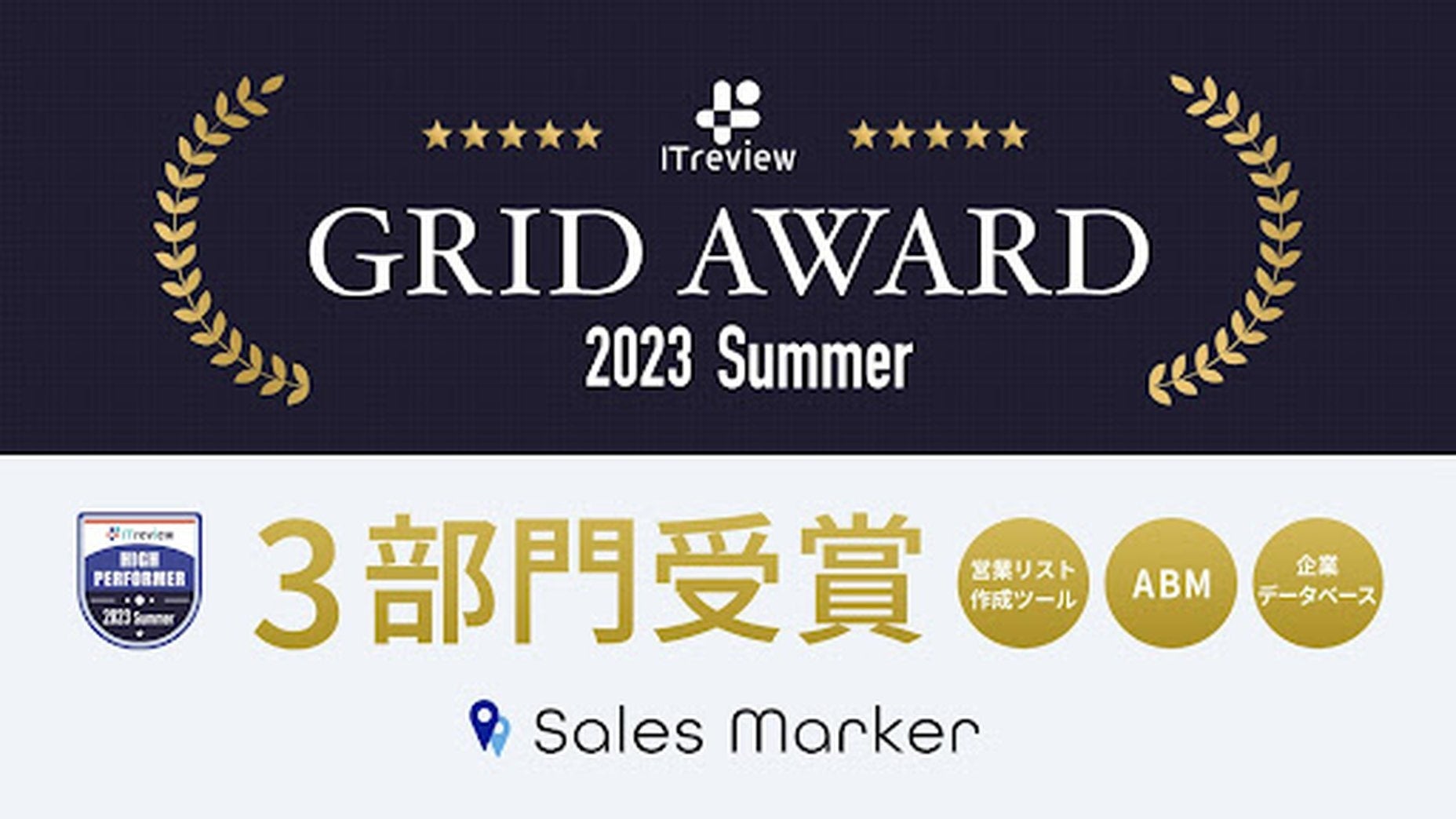 そしてこのたびの「ITreview Grid Award 2023 Summer」では、それらの実績によってABM(アカウントベースドマーケティング、企業データベース、営業リスト作成ツールの3部門で「ハイパフォーマー」に同時認定となりました。なお、今回の受賞は前回に続き2期連続となります。