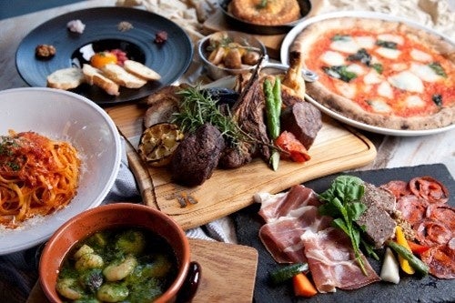 人気のタパスやパスタやピッツァに加え、自家製のシャルキトリーやシェフおススメのお肉料理を豪快に
