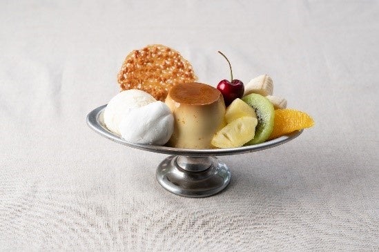シナモンやスターアニスなどのスパイスがふんわりと香る平飼い卵のプリンに、たっぷりと旬のフルーツを