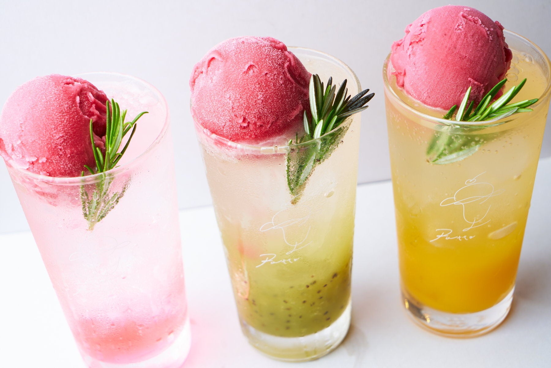 スパークリングカシスフロート(マンゴー・キウイ・ローズレモネード):各¥680(税込)