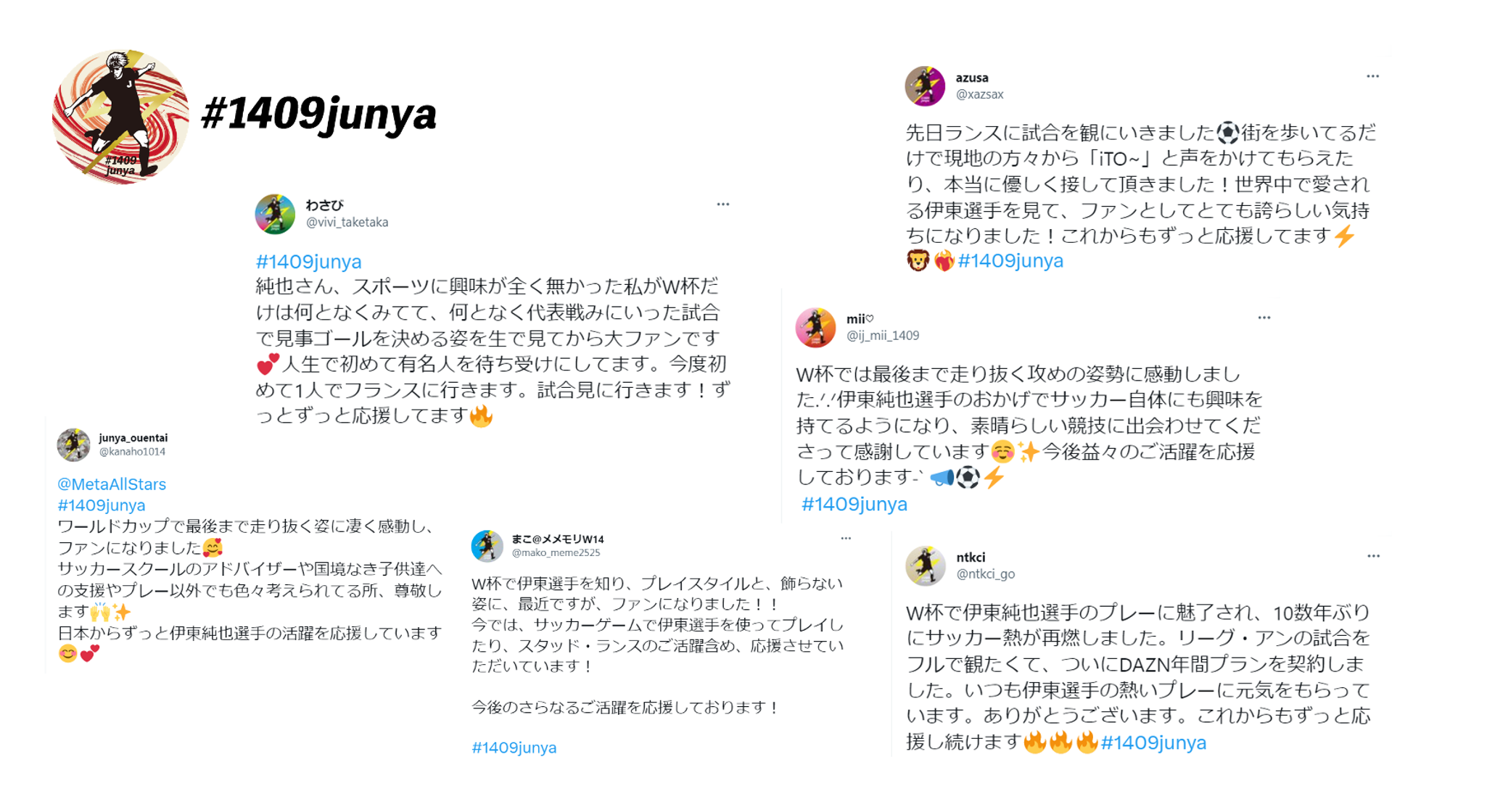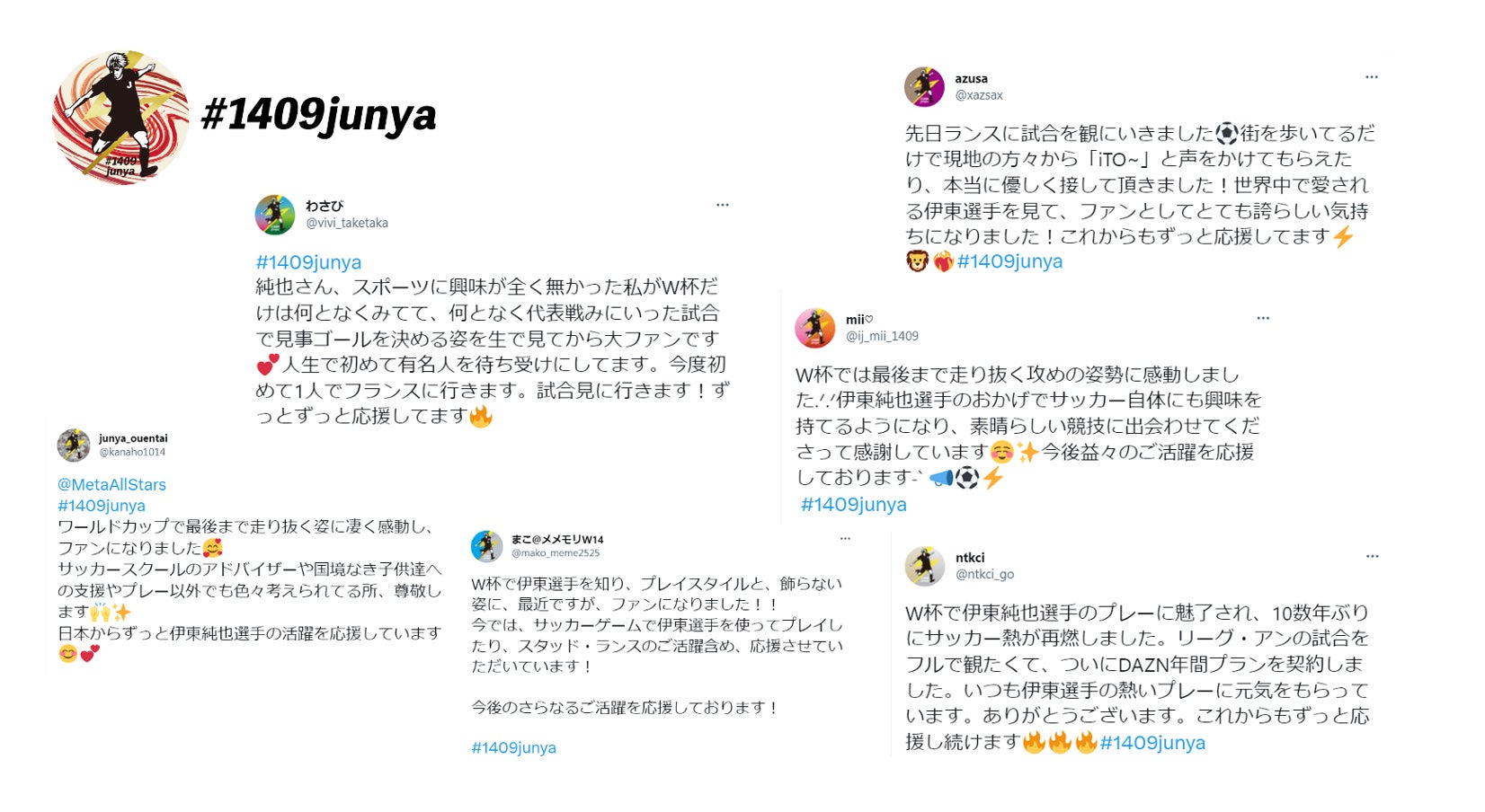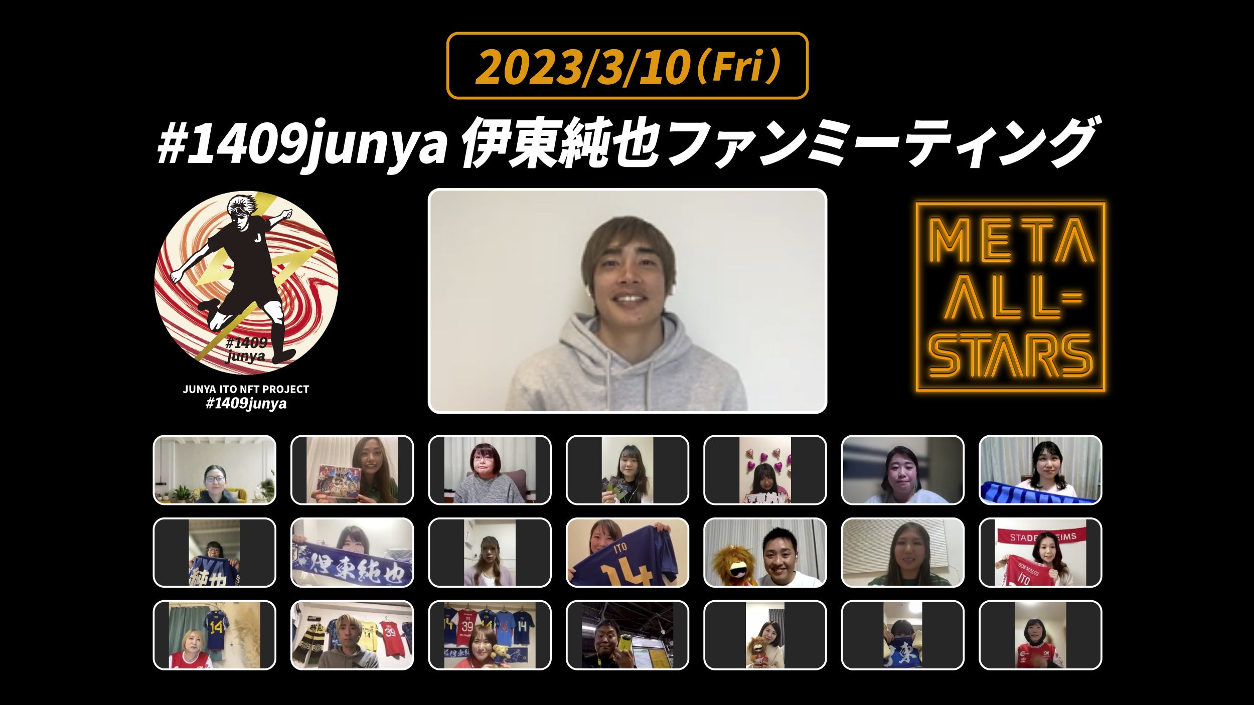 2023年3月10日(金)日本時間23:00から、 「META ALL-STARS」でNFTプロジェクト #1409junya を展開中のサッカー・伊東純也選手(スタッド・ランス)が出演する第1回ファンミーティングを開催。#1409junyaのNFTホルダーだけが参加できる特別なイベントで、アーカイブ視聴権がついたID Stickerは引き続きMETA ALL-STARSで販売中。(https://meta-all-stars.io/ja/product/2hiksBPoxolU2Dp3KQMq/)