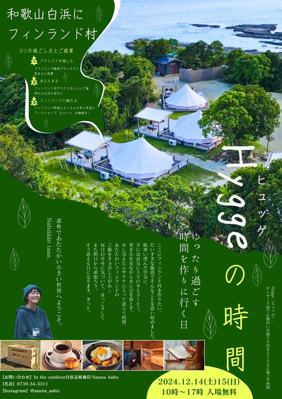 グランピング施設「In the Outdoor白浜志原海岸」内にある本格フィンランドサウナ「Sauna Aalto(サウナ・アアルト」は2024年12月にオープン1周年を迎えます。1周年を記念し、12/14(土)・15(日)の2日間フィンランドの心地よい時間の過ごし方をテーマにしたイベント「Hyggeの時間」を開催します。