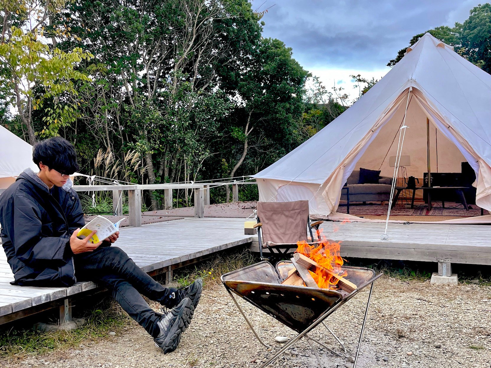 国立公園の大自然の中にあるグランピング施設「In the Outdoor白浜志原海岸」の場内を一部開放しています。テントの中や焚き火のそば、自然の中に椅子を持っていくなど、居心地の良い場所を見つけて1日ゆっくりお過ごしください。