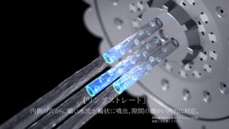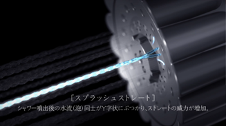 吐出口から出た2本の水流がY字状にぶつかり、ねじれた水流になります。衝突後に外気を取り込むことで、ウルトラファインバブルを生成し、ねじれた水流の汚れをかき出す効果で洗浄力を高めます。ストレート式の水流は、頭皮を洗う際になどに適しています。まとめた髪が水流によってほどけていく様子を映し、スプラッシュストレートの強さを表現しています。