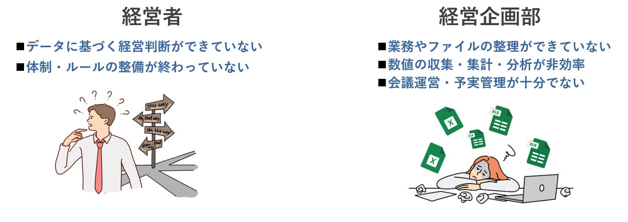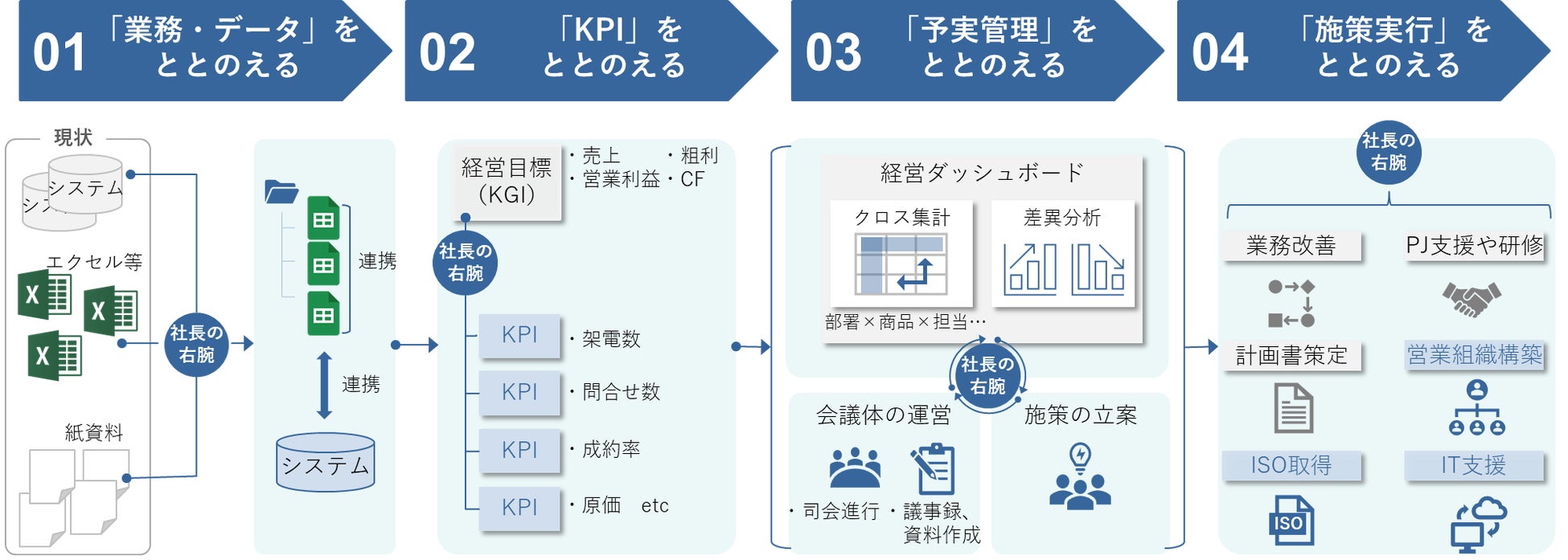 「散らばる社内データや業務の整理」「予実管理のPDCA実施」「データに基づく経営判断の実現」、全て社長の右腕にお任せください!