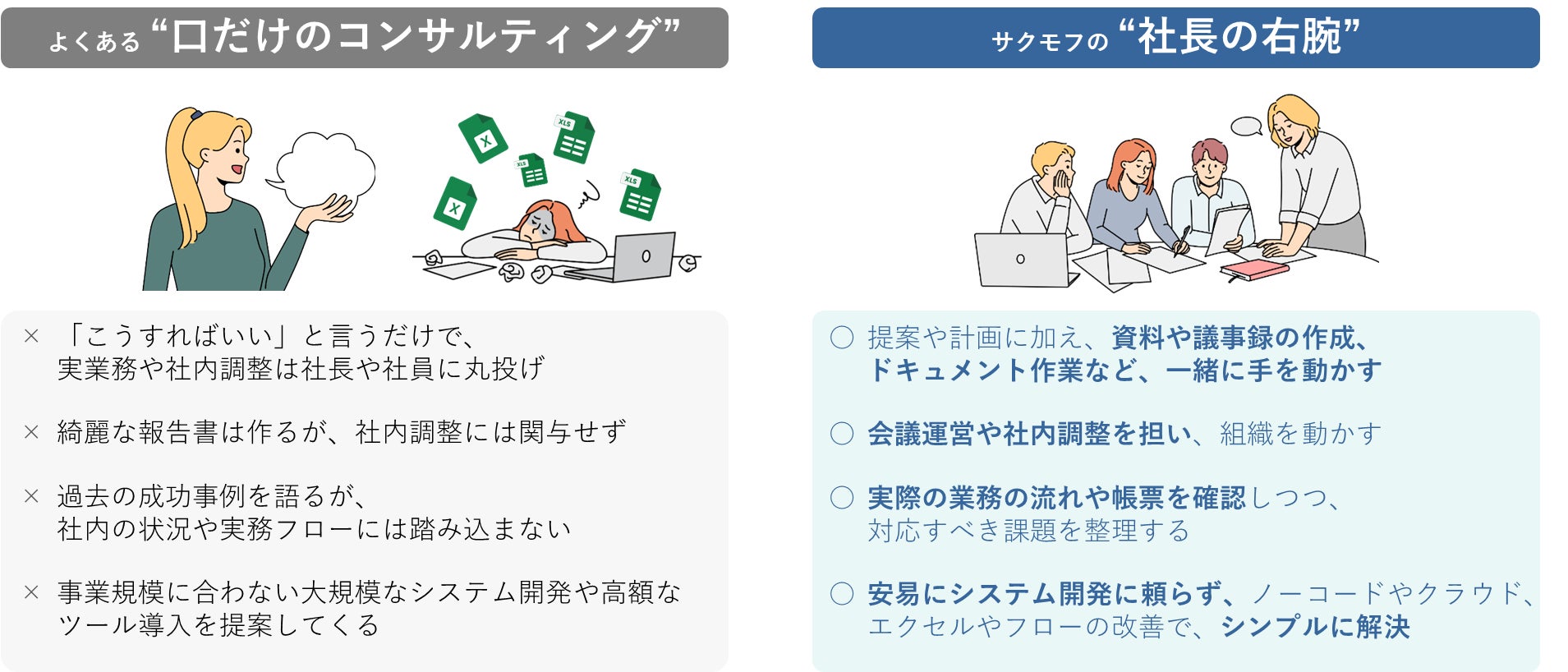 株式会社サクモフ(本社:京都府京都市、代表取締役:諸隈亮祐、藤本将平)は、月5万円から、経営人材が現場に入り込み、貴社の“右腕”として経営企画から施策実行まで伴走する「社長の右腕派遣」サービスの提供を開始したことをお知らせいたします。