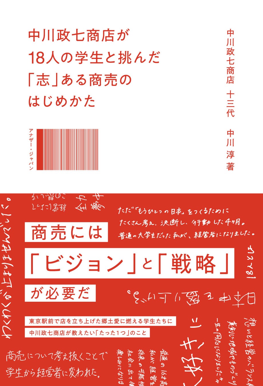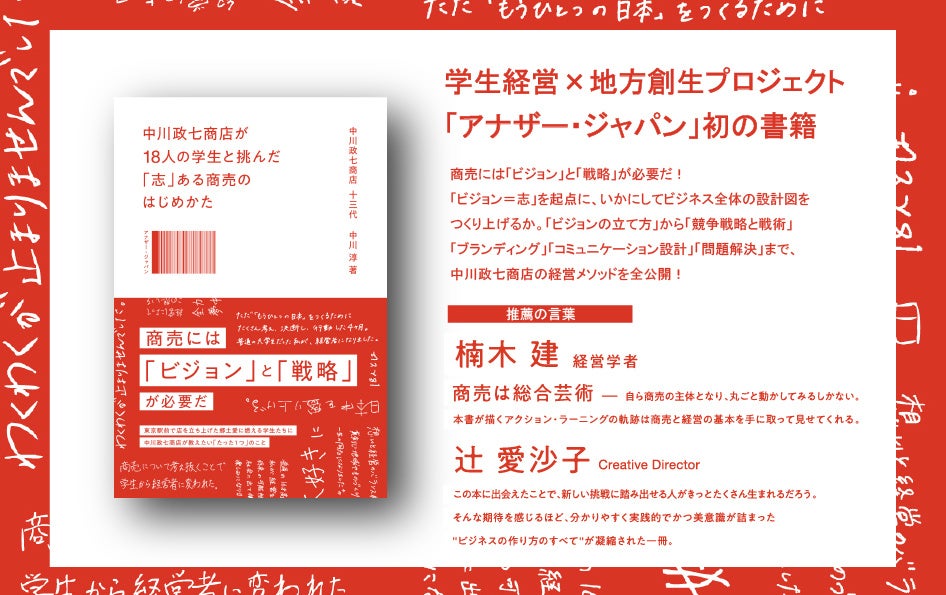三菱地所株式会社と株式会社中川政七商店が進めている、学生が本気で商売を学び実践する47都道府県地域産品セレクトショップ「アナザー・ジャパン」の初書籍『中川政七商店が18人の学生と挑んだ「志」ある商売のはじめかた』が、日経BPより2023年3月27日(月)に発売となります。本著は、アナザー・ジャパンの経営研修を舞台に、志ある商売をはじめるために必要な「ビジョン」と「競争戦略」を両軸で紐解いた、日本初の実況中継教科書です。