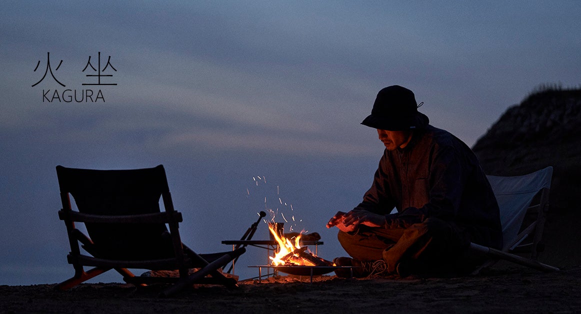KAGURA(火坐)は、焚火の前に胡坐をかいて座ることのできる、焚火を最大限に楽しむ為のチェアです。
