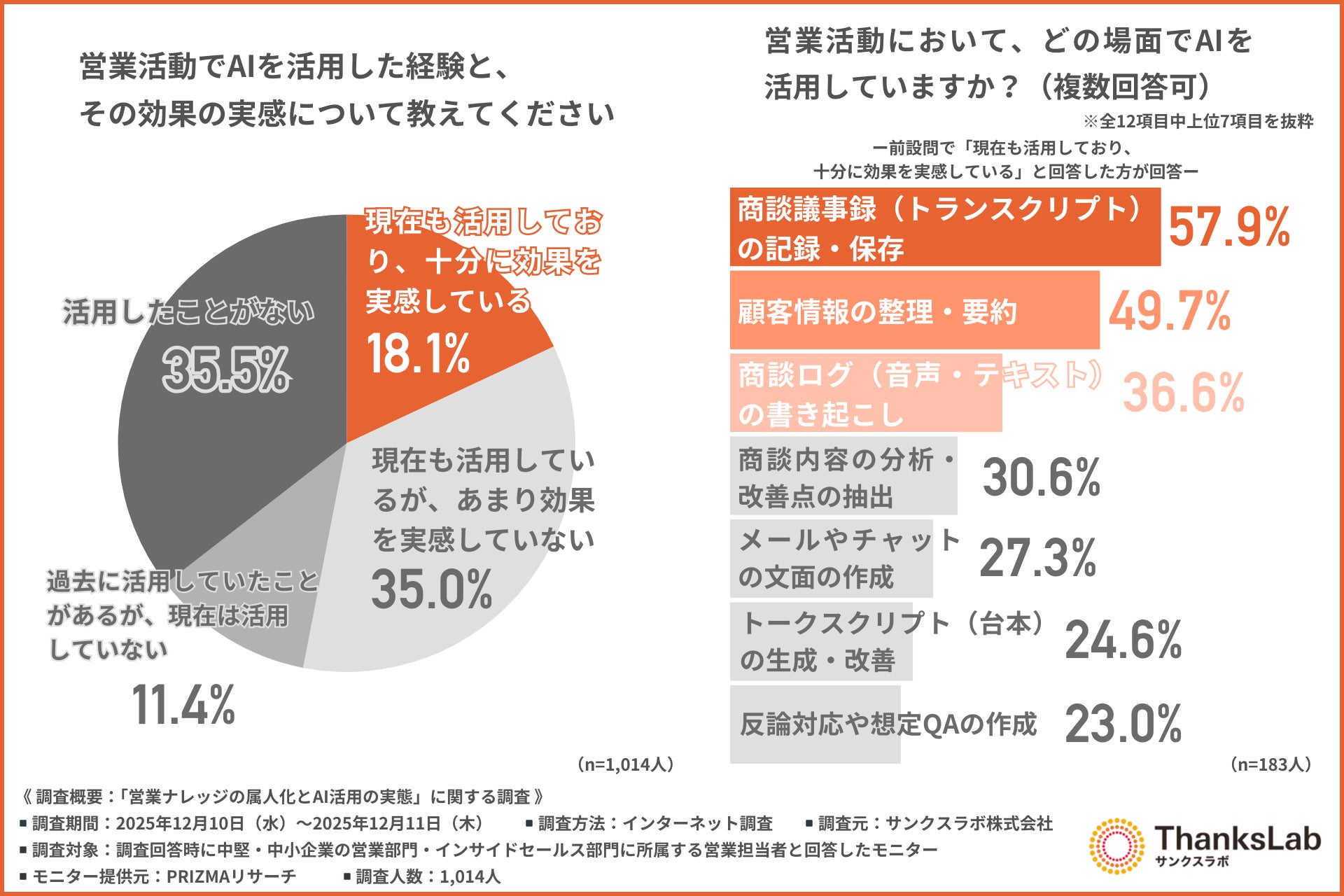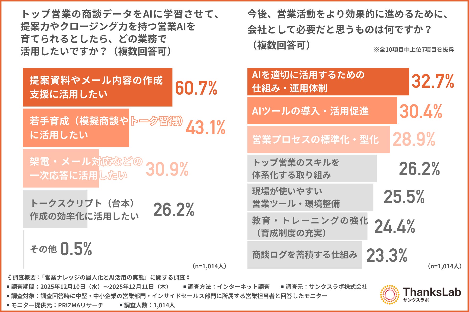 サンクスラボキャリア株式会社(本社所在地:福岡県福岡市、代表取締役社長:雲井 俊太郎)は、中堅・中小企業の営業部門・インサイドセールス部門に所属する営業担当者を対象に「営業ナレッジの属人化とAI活用の実態」に関する調査を行いました。