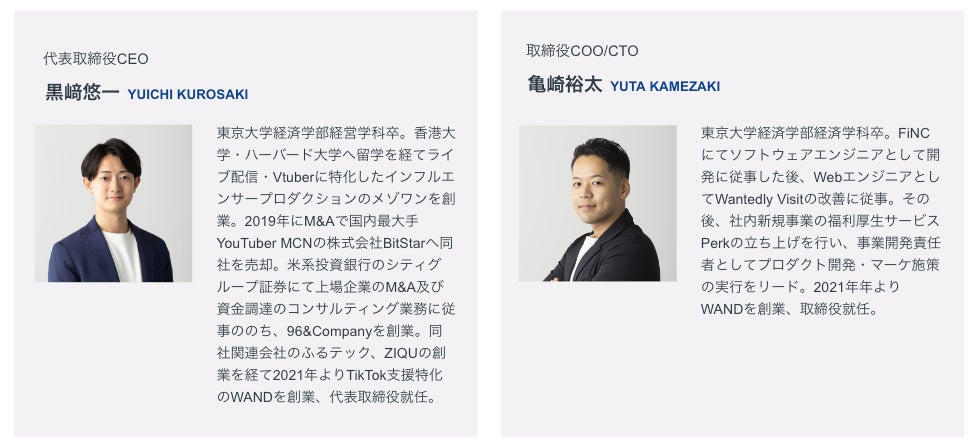 東京大学経済学部卒。香港大学・ハーバ ード大学へ留学を経てライブ配信・ Vtuberに特化したインフルエンサープロ ダクション及び広告代理店のメゾワンを創業。2019年にM&Aで株式会社BitStarへ同社を売却。外資系投資銀行にて上場 企業のM&A及び資金調達のコンサルティング業務に従事ののち、96&Companyを創業。同社関連会社の立ち上げを行った後、2021年よりTikTok支援に特化した WANDを創業、代表取締役就任。