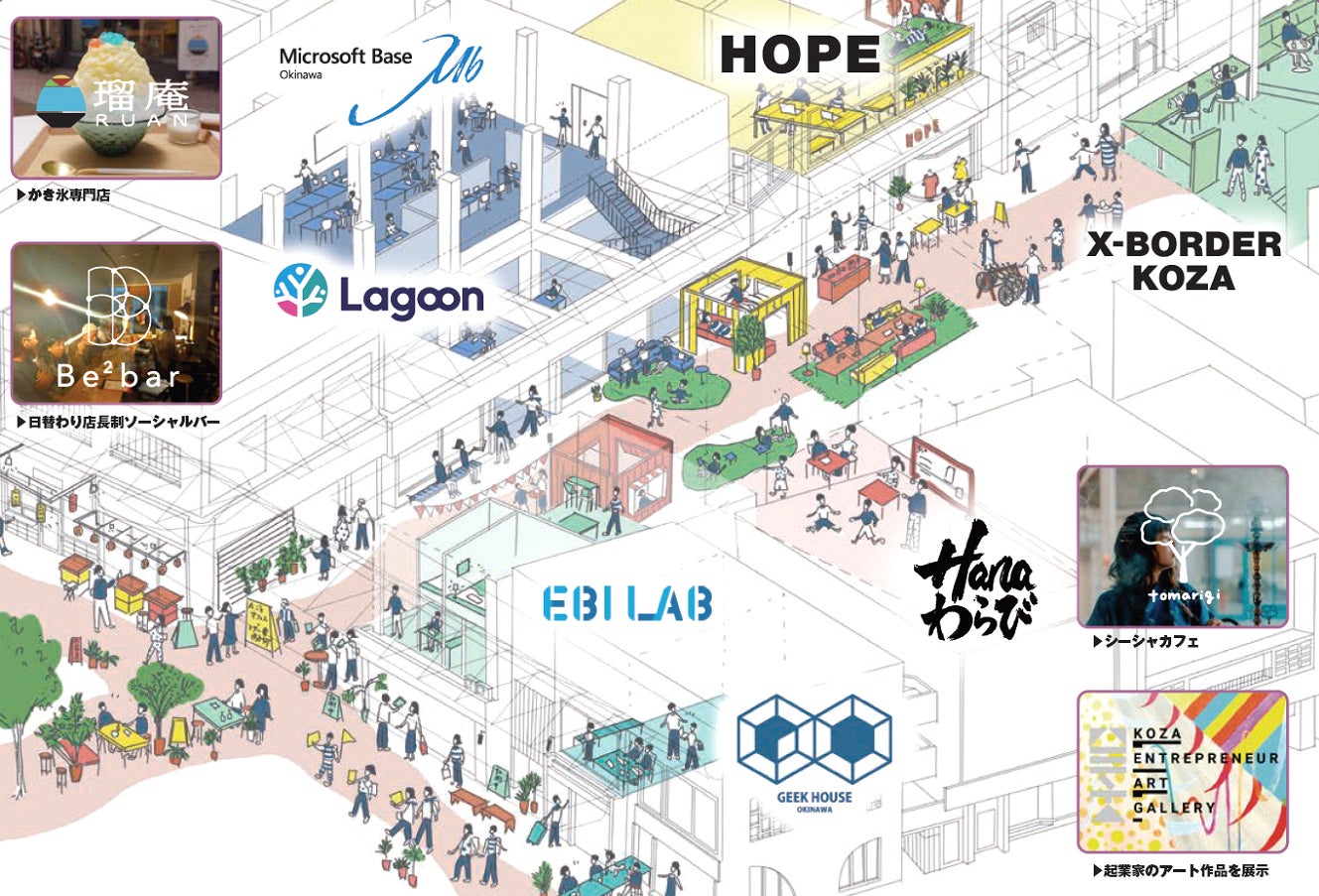 コザスタートアップ商店街は、多様な挑戦者の拠点の集積地として、コワーキングスペースやシェアオフィス、スタートアップや県内外企業のオフィス、エンジニア向けのシェアハウス、ワーケーション向けホテル、ソーシャルバー、アートギャラリー、フリースクール等、多様な場から構成されています。「世界にイノベーションを起こす挑戦者を生み出す商店街」を目指し、沖縄発のスタートアップや挑戦者の成長の土台として人や資本を行き来させるプラットフォームとして成長を続けています。