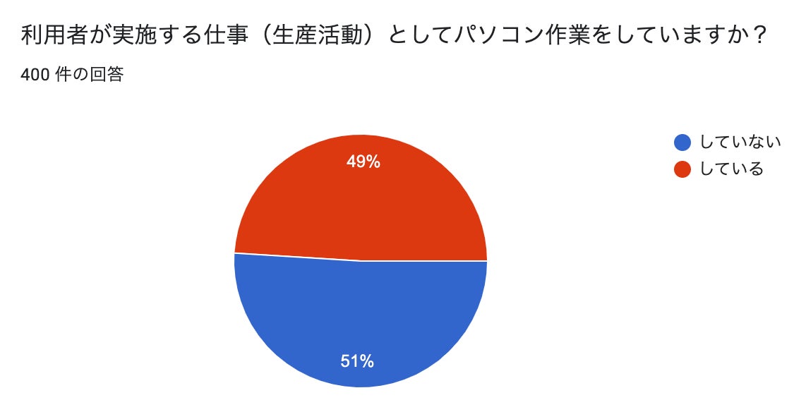 就労継続支援B型の利用者が実施する仕事(生産活動)として、パソコンを使った作業をしている事業所は49%でした。日本財団の2017年の調査結果である「2.9%」と比較すると、パソコンを使った生産活動を実施する就労継続支援B型事業所が増えてきていることがわかりました。