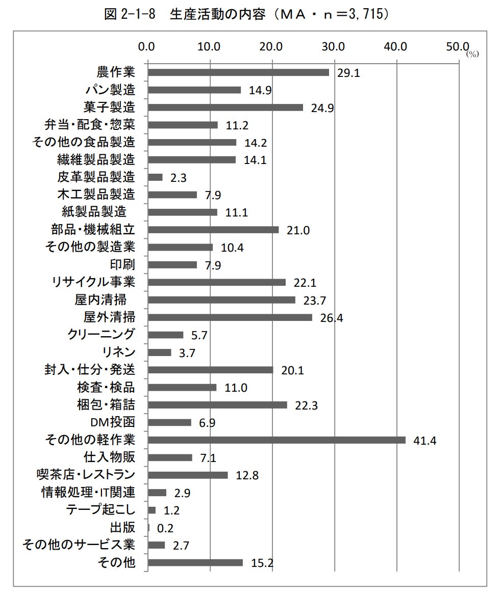 また、2017年に日本財団が実施した「就労支援B型事業所に対するアンケート調査」によると、障害のある方の仕事(生産活動)としてパソコンを使った仕事をしている就労継続支援B型事業所は「2.9%」と非常に少ないことが報告されています。