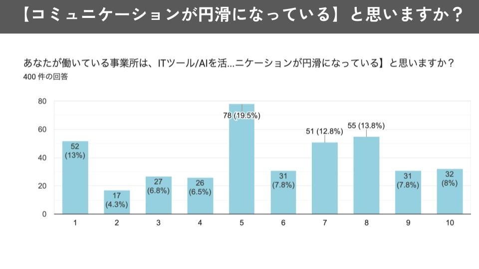 ITツール/AIを活用している効果の実感について【業務効率が向上している】【コミュニケーションが円滑になっている】【利用者への支援の質が向上している】の3つの視点で10段階評価を回収した結果、下記のグラフのような結果でした。