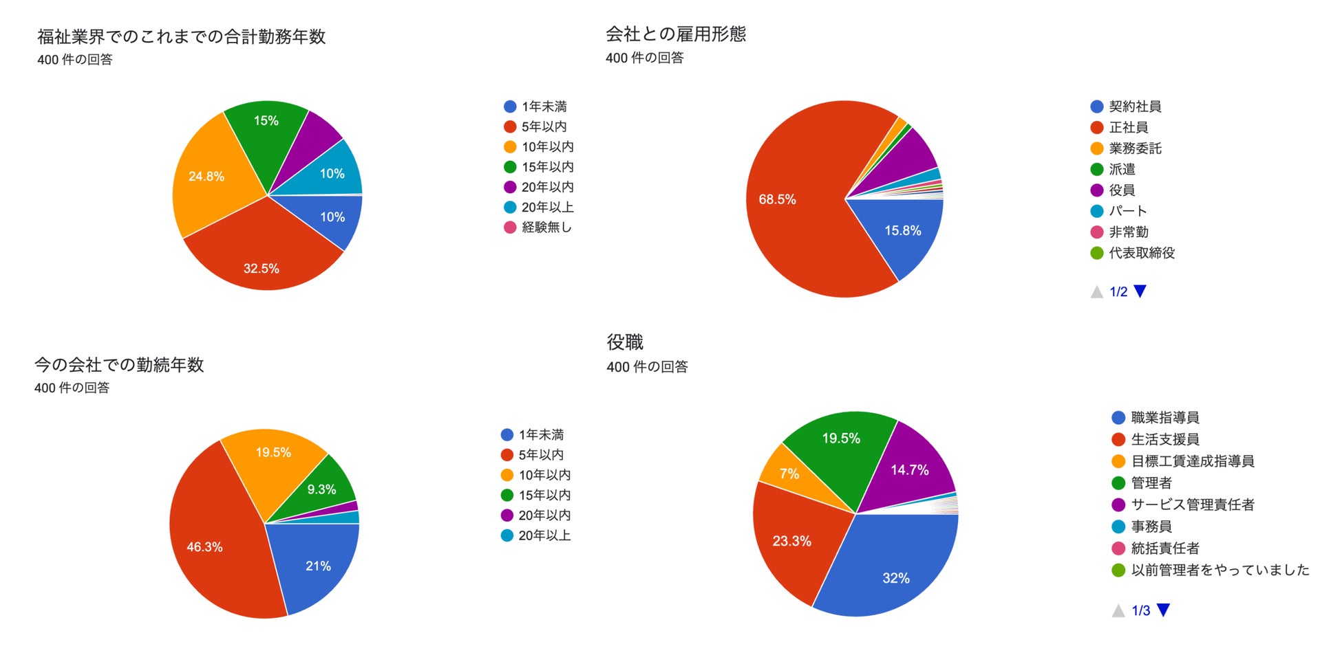 なお、「オンラインでの調査」のため回答者が比較的若い年齢で、福祉業界での勤続年数も短い方が中心であり、ITリテラシーがある程度高い層に回答の偏りがあると考えられる点にはデータを読み解く上で注意が必要です。