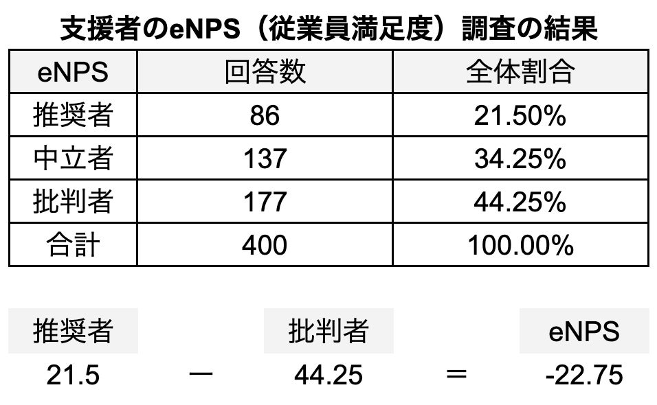就労継続支援B型事業所で支援者として働く方のeNPSは「-22.75」で批判者の方が多い結果でした。