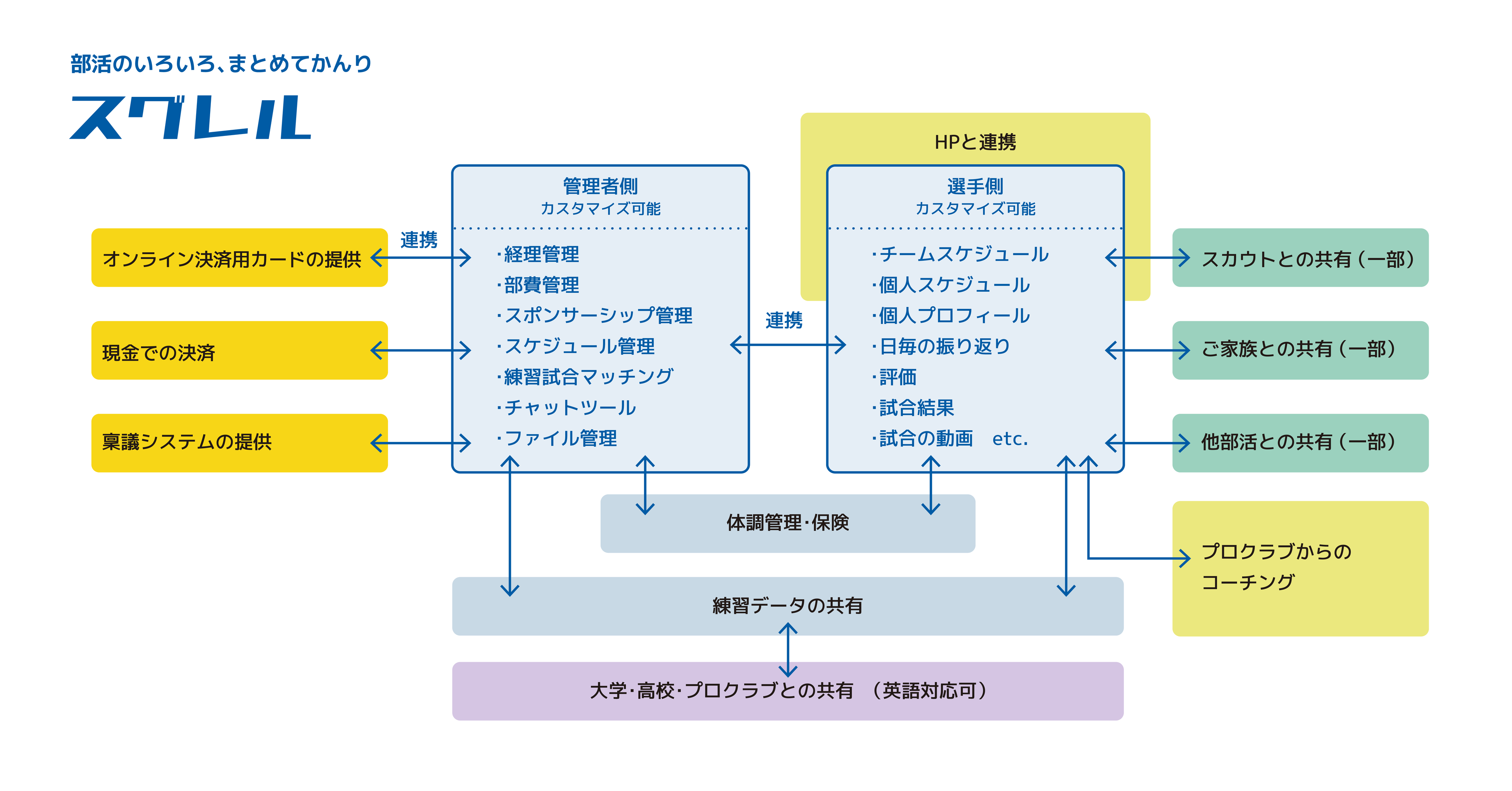 現在、大学だけではなく高校、地域クラブを含めて運営におけるツールの一元化やDX化、選手のデータ管理、データのプロクラブへの提供や共有、または部活動における様々なツールが分断されたサービスでの運用になっている課題があります。