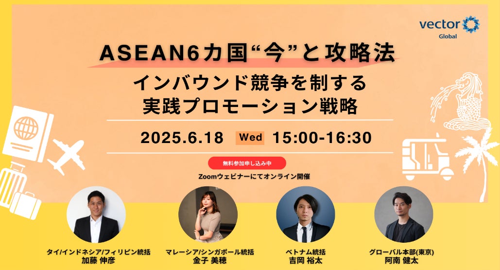 株式会社ベクトル(本社:東京都港区、代表取締役会長兼社長:西江 肇司、東証プライム:6058、以下ベクトル)は、ASEAN主要6カ国(タイ・インドネシア・フィリピン・マレーシア・シンガポール・ベトナム)を対象とした最新インバウンドマーケティングセミナー「ASEAN6カ国の“今”と攻略法 インバウンド競争を制する実践プロモーション戦略」を6月18日(水)にオンラインにて開催いたします。