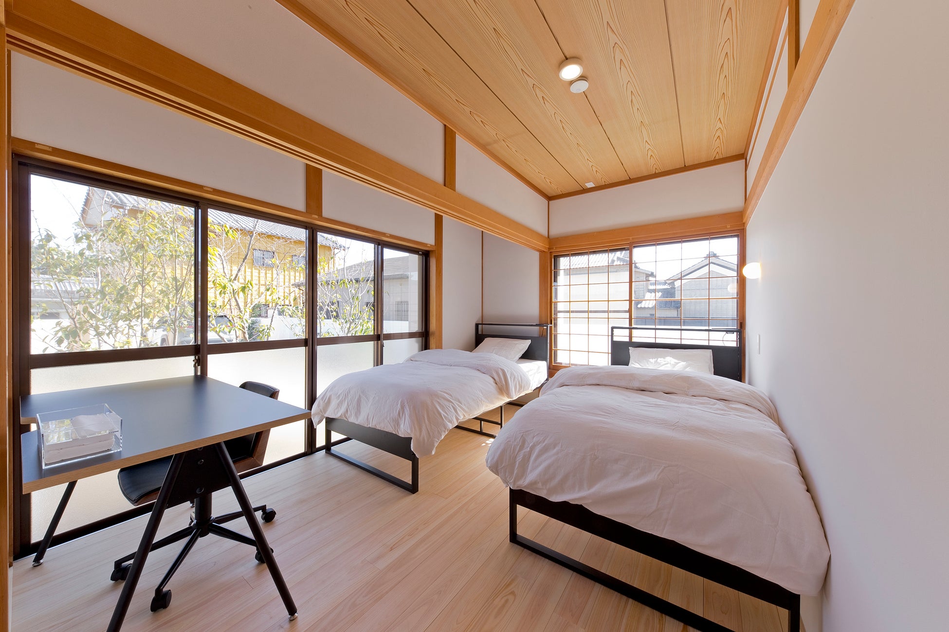 3LDKの広さがあり最大8人までご宿泊いただけます。寝室が3部屋、シングルサイズのベッドを6台、ご用意しております。各寝室にワークスペースも設けており、Wi-Fiも完備していますのでワーケーションとしてもご利用いただけます。