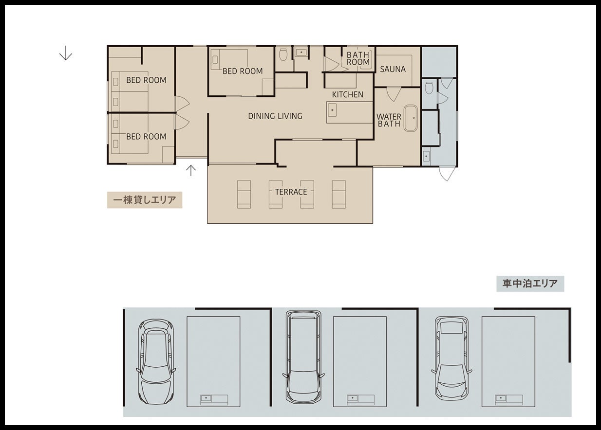 サウナが併設され、敷地内にある車中泊スペースには各区画にミニキッチンがあり、屋外用のシャワールームやトイレも完備しています。オートキャンプ感覚でご利用いただくことができます。