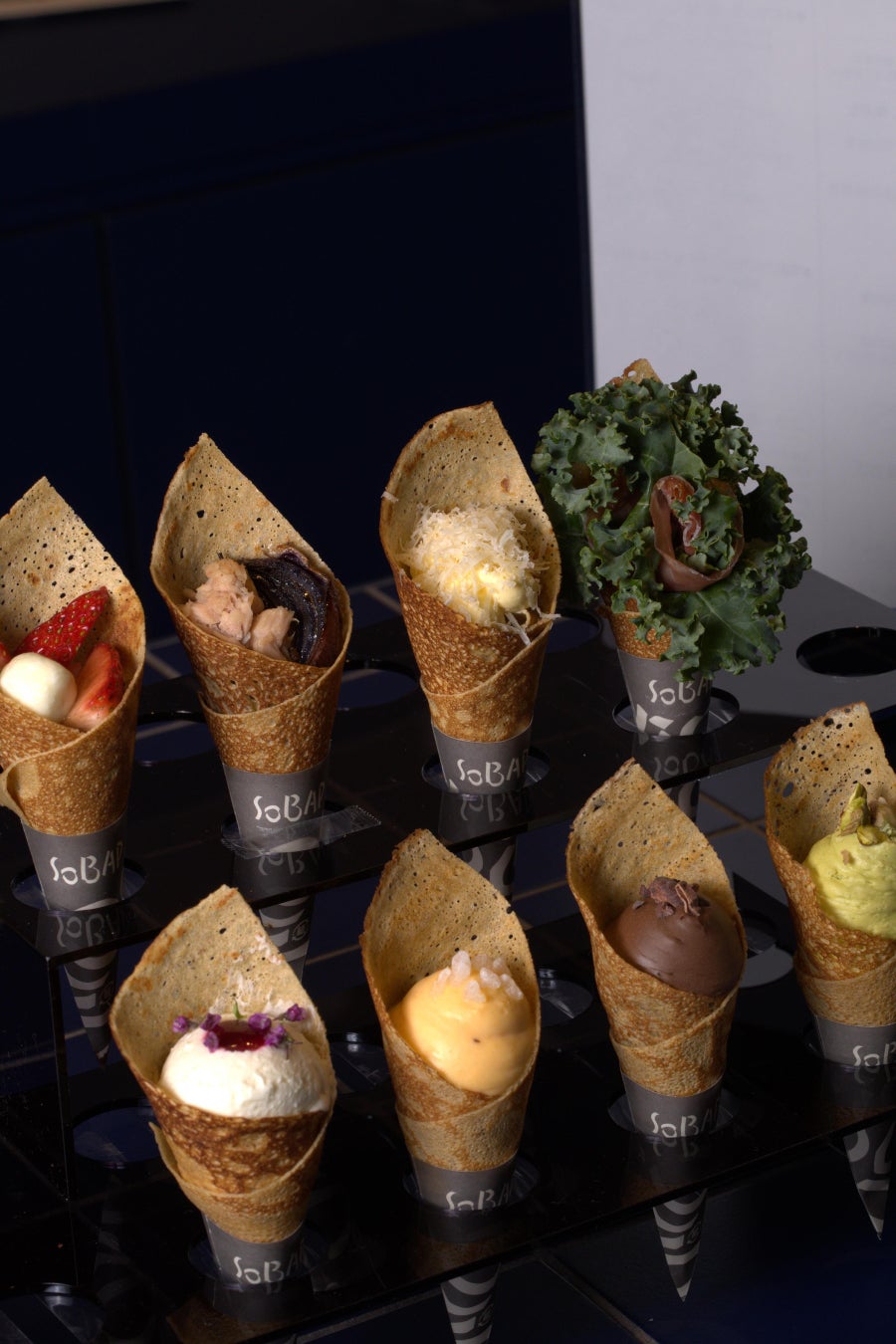 「クレープを手土産に」をコンセプトに、クレープは本来その場で食べる事が主流ですが持ち歩きやすいようなサイズ感にすることで1人でもいろんな味を楽しめる”選ぶ楽しさ”も追及しました。生地には、そば粉を練り込み、その上に色とりどりの食材が並びます。甘いものから塩気のあるものまで、色々な食べ方で楽しんでいただけます。