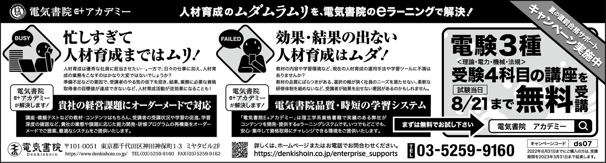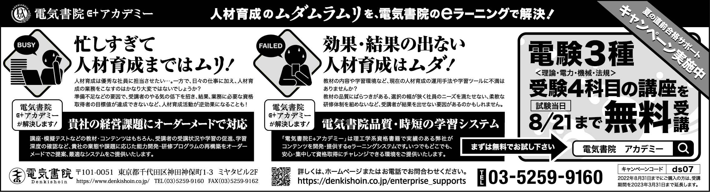 理工学専門図書出版を手掛ける、株式会社電気書院(所在地:東京都千代田区神田神保町1-3、代表取締役:田中聡)は、2022年7月15日(金)より、「電気書院E+アカデミー電験3種直前合格サポートキャンペーン」を開催いたします。