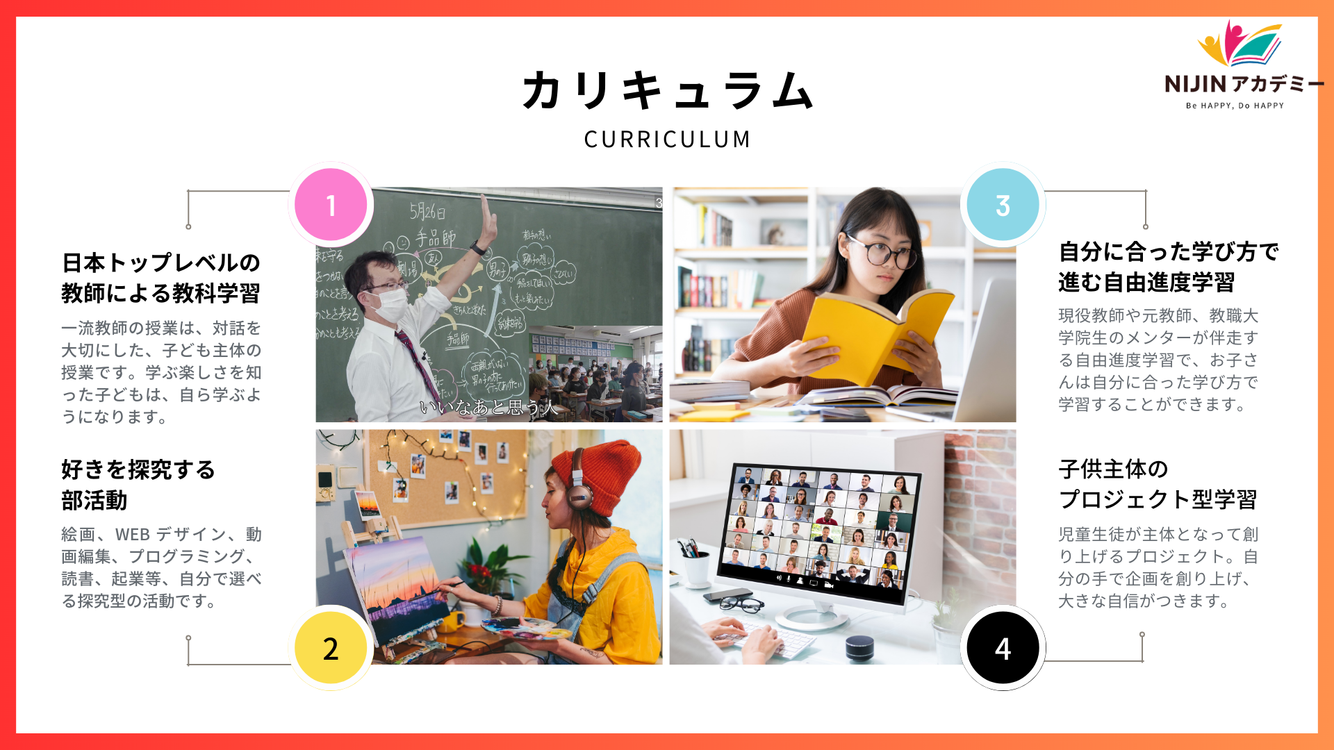 そういった「学力不安」に悩む不登校家庭の想いを受けとめ、これまで教員研修と授業の質にこだわった教育事業を創りつづけてきたNIJINが取り組んだのが、学校に行かなくても学校以上に質の高い授業を受けることのできるオンラインスクールの開発です。日本トップレベルの現役教師による授業を自宅で受けられ、全国の友達と対話的・協働的に学ぶことができる「NIJINアカデミー」が、不登校家庭が抱える悩みや不安をハッピーに解消します。
