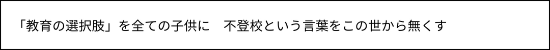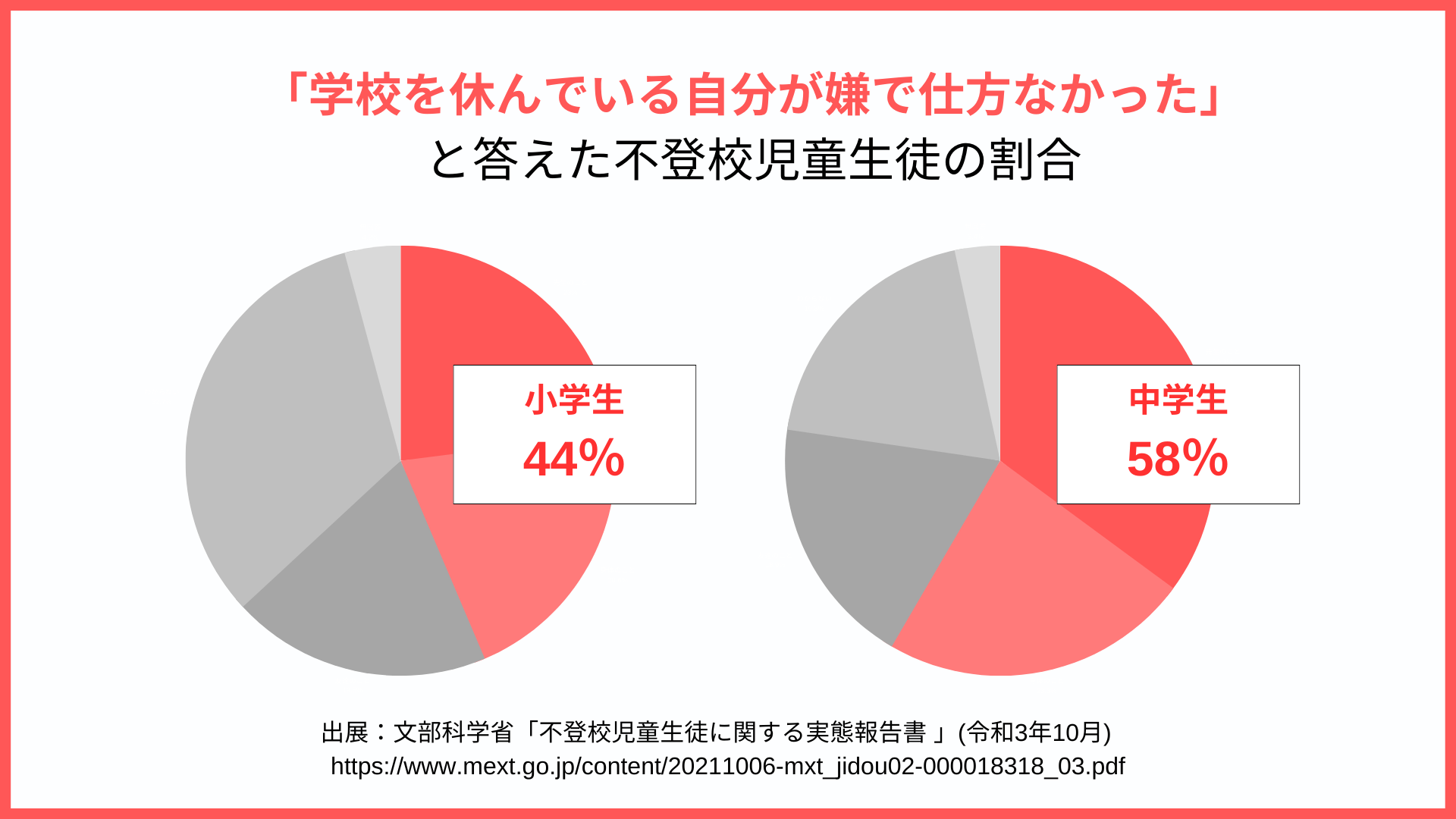 令和3年文科省の「不登校児童生徒の実態把握に関する調査報告書」によると、不登校小学生の44%、不登校中学生の58%が「学校を休んでいる自分が嫌で仕方なかった」と回答しました。不登校家庭へのヒアリングにおいては、「学校に行かない自分はダメな子供なんだ」「学校に行かなくなってから外出しづらくなった」「我が子が学校に行っていないことに負い目があった」という声が聞かれたように、学校に行くことが目的であり、学校に行かないことは悪であるという固定観念が子どもの豊かな学びを奪っていると私たちは考えます。