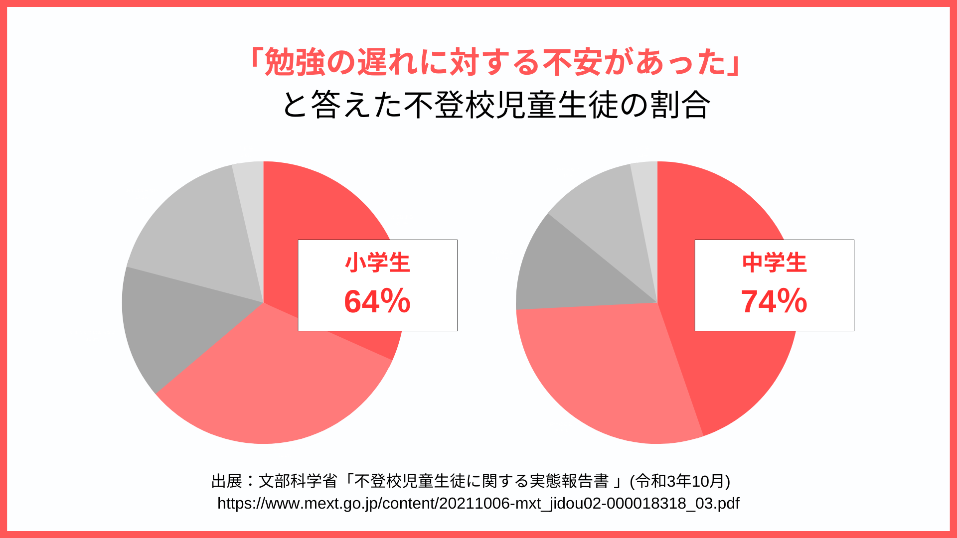 令和3年文科省の「不登校児童生徒の実態把握に関する調査報告書」によると、学校を休んでいることの不安について、小学生児童の64%および中学生生徒の74%が「勉強の遅れに対する不安があった」と回答しました。当社が実施した不登校家庭へのヒアリングにおいて、不登校のお子さんに対して保護者が不安に思うことのトップが「学力」でした。