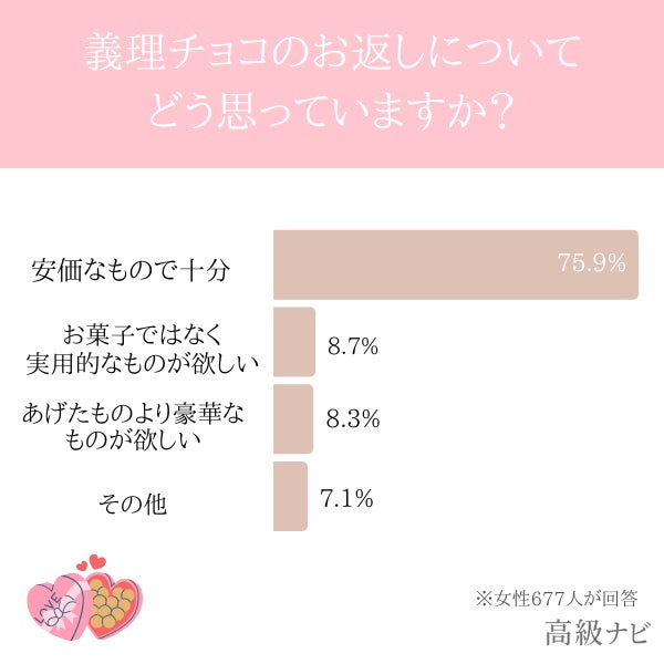 「豪華なものよりも、安価なチョコで十分」という女性の割合が約7割を占めたことから、女性側は男性からのお返しにはあまり期待していないということが読み取れます。